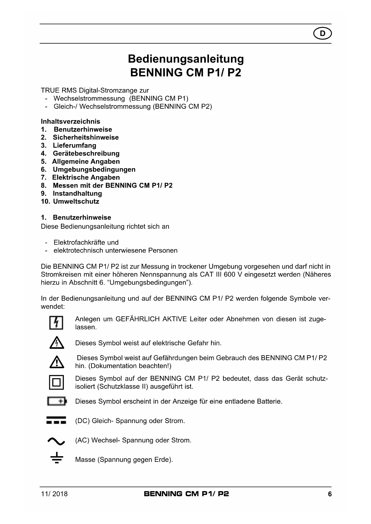 TRUE RMS Digital-Stromzange zur - Wechselstrommessung (BENNING CM P1) - Gleich-/ Wechselstrommessung (BENNING CM P2)Inhaltsverzeichnis 1. Benutzerhinweise 2. Sicherheitshinweise 3. Lieferumfang 4. Gerätebeschreibung 5. Allgemeine Angaben 6. Umgebungsbedingungen 7. Elektrische Angaben 8. Messen mit der BENNING CM P1/ P2 9. Instandhaltung 10. Umweltschutz1. BenutzerhinweiseDiese Bedienungsanleitung richtet sich an - Elektrofachkräfte und - elektrotechnisch unterwiesene PersonenDie BENNING CM P1/ P2 ist zur Messung in trockener Umgebung vorgesehen und darf nicht in Stromkreisen mit einer höheren Nennspannung als CAT III 600 V eingesetzt werden (Näheres hierzu in Abschnitt 6. “Umgebungsbedingungen”). In der Bedienungsanleitung und auf der BENNING CM P1/ P2 werden folgende Symbole ver-wendet: Anlegen um GEFÄHRLICH AKTIVE Leiter oder Abnehmen von diesen ist zuge-lassen. Dieses Symbol weist auf elektrische Gefahr hin. Dieses Symbol weist auf Gefährdungen beim Gebrauch des BENNING CM P1/ P2 hin. (Dokumentation beachten!) Dieses Symbol auf der BENNING CM P1/ P2 bedeutet, dass das Gerät schutz-isoliert (Schutzklasse II) ausgeführt ist.Dieses Symbol erscheint in der Anzeige für eine entladene Batterie.(DC) Gleich- Spannung oder Strom. (AC) Wechsel- Spannung oder Strom. Masse (Spannung gegen Erde).11/ 2018