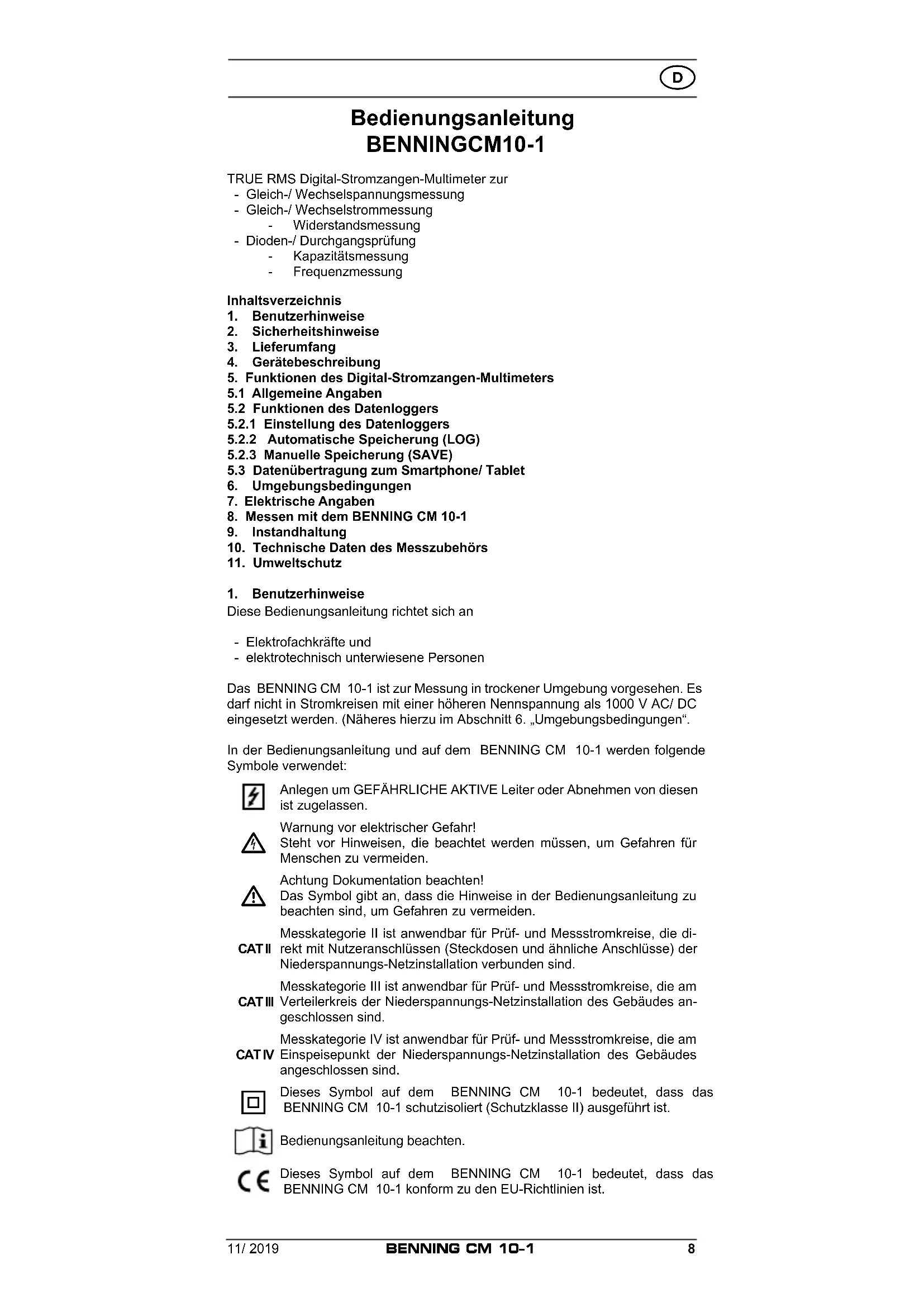 Dieses Symbol auf dem BENNING CM 10-1 bedeutet, dass das BENNING CM 10-1 schutzisoliert (Schutzklasse II) ausgeführt ist. Bedienungsanleitung beachten. Dieses Symbol auf dem BENNING CM 10-1 bedeutet, dass das BENNING CM 10-1 konform zu den EU-Richtlinien ist.9
