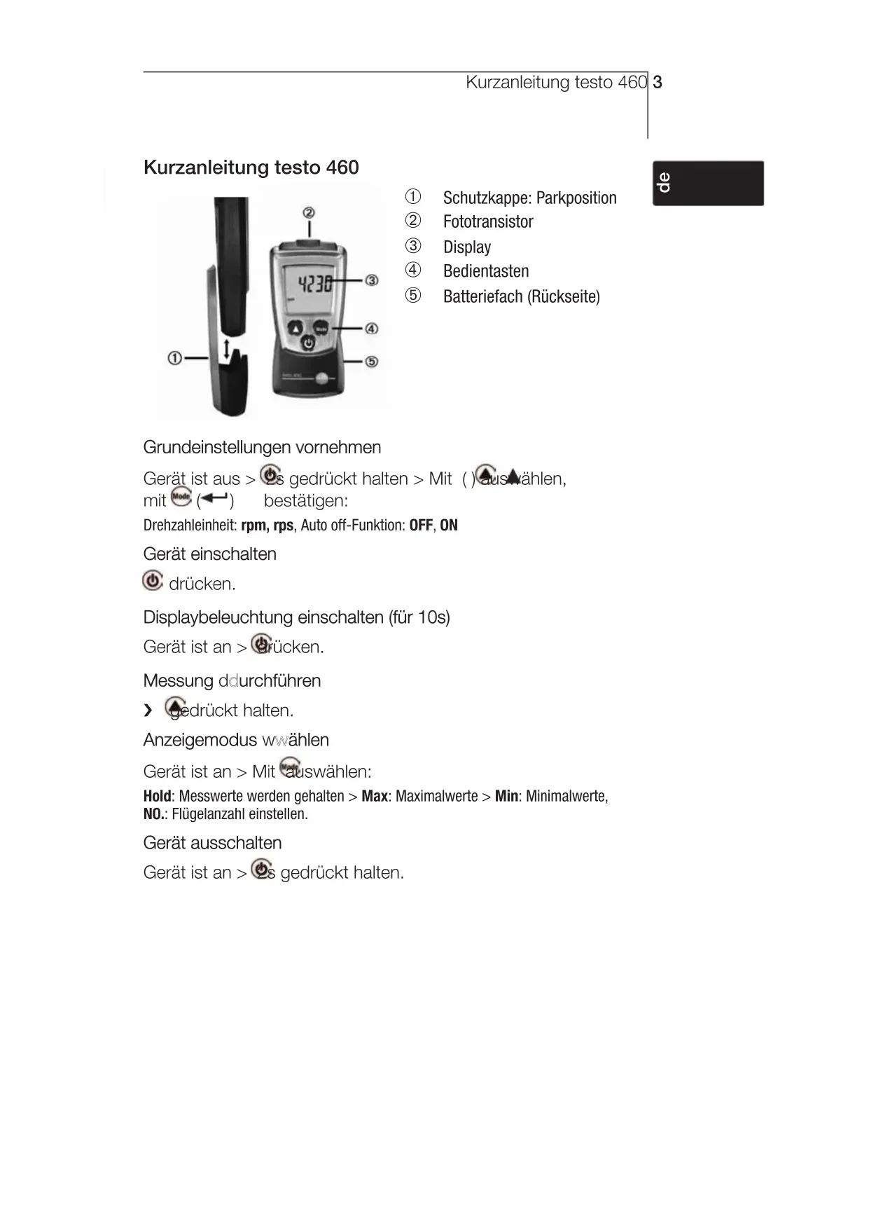 - - 41 Manual de instruções pt - 49Kurzanleitung testo 460 3 Kurzanleitung testo 460 Schutzkappe: Parkposition Fototransistor Display Bedientasten Batteriefach (Rückseite) Grundeinstellungen vvornehmen Gerät ist aus > 2s gedrückt halten > Mit ( ) auswählen, mit ( ) bestätigen: Drehzahleinheit: rpm, rps, Auto off-Funktion: OFF, ON Gerät eeinschalten drücken. Displaybeleuchtung eeinschalten ((für 110s) Gerät ist an > drücken. Messung ddurchführen i gedrückt halten. Anzeigemodus wwählen Gerät ist an > Mit auswählen: Hold: Messwerte werden gehalten > Max: Maximalwerte > Min: Minimalwerte, NO.: Flügelanzahl einstellen. Gerät aausschalten Gerät ist an > 2s gedrückt halten. p. 43