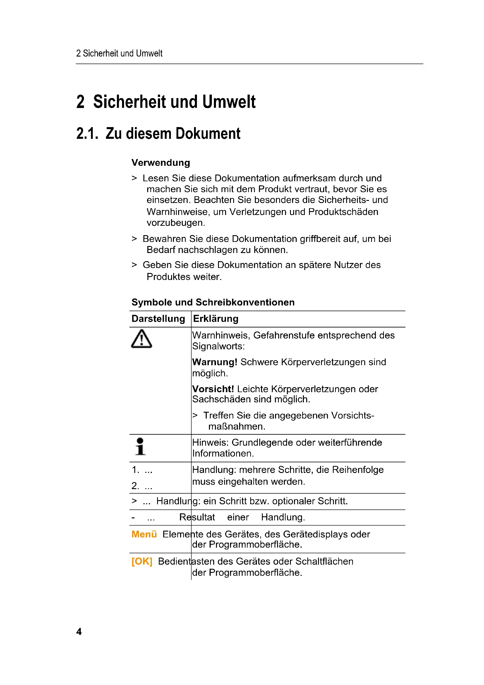 Pos: 3 /TD/Überschr iften/2. Sicher heit und Umwelt @ 0\mod_11737747 19351_6.doc @ 290 @ 1 2 Sicherheit und Umwelt Pos: 4 /TD/Überschr iften/2.1 Zu diesem Doku ment @ 0\mod_117377525235 1_6.doc @ 344 @ 2 2.1. Zu diesem Dokument Pos: 5 /TD/Sicherhei t und Umwelt/Zu diesem Doku ment/Verwendung (Standar d) @ 0\mod_11737750685 54_6.doc @ 335 @ 5 Verwendung > Lesen Sie diese Dokumentation aufmerksam durch und machen Sie sich mit dem Produkt vertraut, bevor Sie es einsetzen. Beachten Sie besonders die Sicherheits- und Warnhinweise, um Verletzungen und Produktschäden vorzubeugen. > Bewahren Sie diese Dokumentation griffbereit auf, um bei Bedarf nachschlagen zu können. > Geben Sie diese Dokumentation an spätere Nutzer des Produktes weiter. Pos: 6 /TD/Sicherhei t und Umwelt/Zu diesem Doku ment/Symbole und Schr eibkonv. [Standard] @ 0\ mod_1174982140622_6.doc @ 514 @ 5 Symbole und Schreibkonventionen Darstellung Erklärung Warnhinweis, Gefahrenstufe entsprechend des Signalworts: Warnung! Schwere Körperverletzungen sind möglich. Vorsicht! Leichte Körperverletzungen oder Sachschäden sind möglich. > Treffen Sie die angegebenen Vorsichts- maßnahmen. Hinweis: Grundlegende oder weiterführende Informationen.