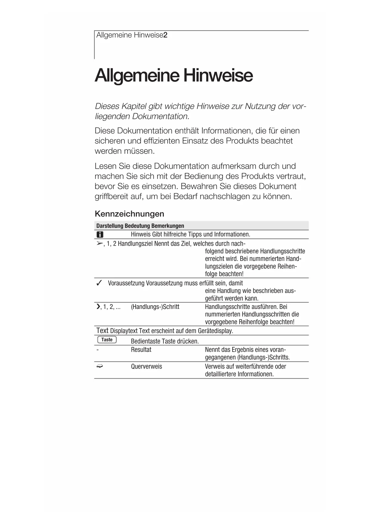 Allgemeine Hinweise Dieses Kapitel gibt wichtige Hinweise zur Nutzung der vor- liegenden Dokumentation. Diese Dokumentation enthält Informationen, die für einen sicheren und effizienten Einsatz des Produkts beachtet werden müssen. Lesen Sie diese Dokumentation aufmerksam durch und machen Sie sich mit der Bedienung des Produkts vertraut, bevor Sie es einsetzen. Bewahren Sie dieses Dokument griffbereit auf, um bei Bedarf nachschlagen zu können. Kennzeichnungen Darstellung Bedeutung Bemerkungen Hinweis Gibt hilfreiche Tipps und Informationen. ±, 1, 2 Handlungsziel Nennt das Ziel, welches durch nach- folgend beschriebene Handlungsschritte erreicht wird. Bei nummerierten Hand- lungszielen die vorgegebene Reihen- folge beachten! Voraussetzung Voraussetzung muss erfüllt sein, damit eine Handlung wie beschrieben aus- geführt werden kann. i, 1, 2, ... (Handlungs-)Schritt Handlungsschritte ausführen. Bei nummerierten Handlungsschritten die vorgegebene Reihenfolge beachten! Text Displaytext Text erscheint auf dem Gerätedisplay. Bedientaste Taste drücken. - Resultat Nennt das Ergebnis eines voran- gegangenen (Handlungs-)Schritts. º Querverweis Verweis auf weiterführende oder detailliertere Informationen. Taste1. Sicherheitshinweise 3