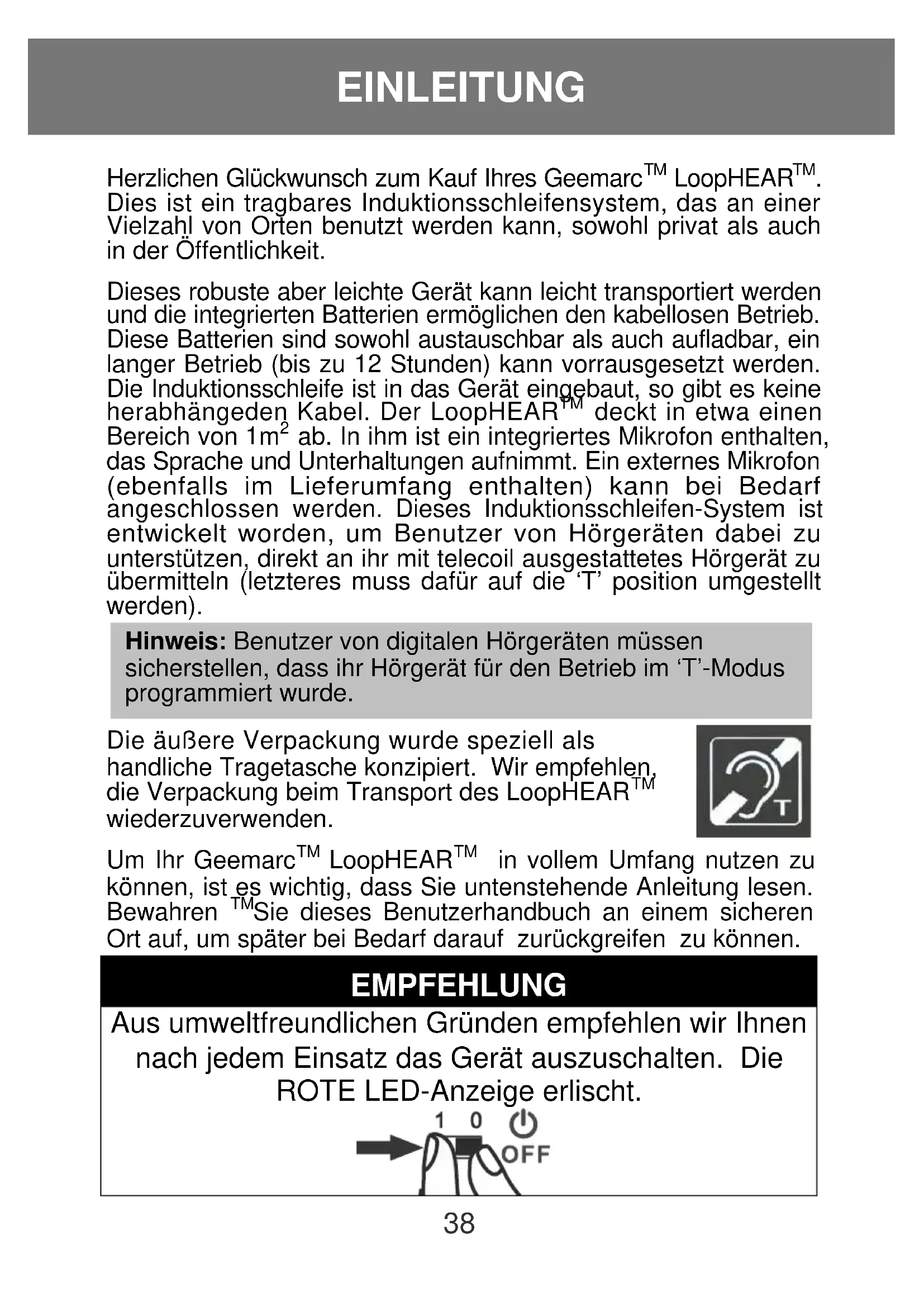 Sie dieses Benutzerhandbuch an einem sicheren Ort auf, um später bei Bedarf darauf zurückgreifen zu können. EMPFEHLUNG Aus umweltfreundlichen Gründen empfehlen wir Ihnen nach jedem Einsatz das Gerät auszuschalten. Die ROTE LED-Anzeige erlischt. Hinweis: Benutzer von digitalen Hörgeräten müssen sicherstellen, dass ihr Hörgerät für den Betrieb im ‘T’-Modus programmiert wurde. EINLEITUNG39 Auspacken des LoopHEAR