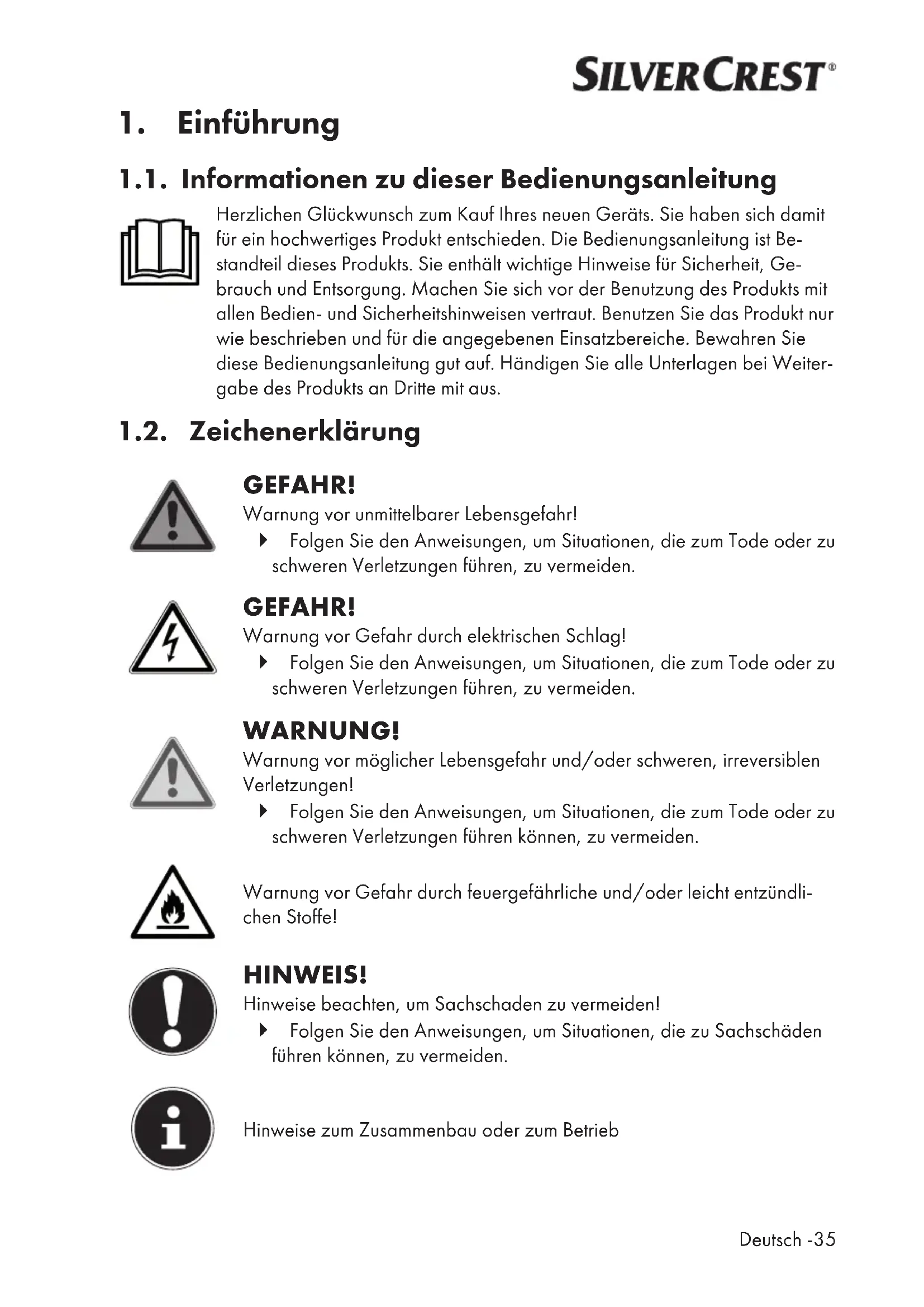 1.1. Informationen zu dieser Bedienungsanleitung Herzlichen Glückwunsch zum Kauf Ihres neuen Geräts. Sie haben sich damit für ein hochwertiges Produkt entschieden. Die Bedienungsanleitung ist Be- standteil dieses Produkts. Sie enthält wichtige Hinweise für Sicherheit, Ge- brauch und Entsorgung. Machen Sie sich vor der Benutzung des Produkts mit allen Bedien- und Sicherheitshinweisen vertraut. Benutzen Sie das Produkt nur wie beschrieben und für die angegebenen Einsatzbereiche. Bewahren Sie diese Bedienungsanleitung gut auf. Händigen Sie alle Unterlagen bei Weiter- gabe des Produkts an Dritte mit aus. 1.2. Zeichenerklärung GEFAHR! Warnung vor unmittelbarer Lebensgefahr! Folgen Sie den Anweisungen, um Situationen, die zum Tode oder zu schweren Verletzungen führen, zu vermeiden. GEFAHR! Warnung vor Gefahr durch elektrischen Schlag! Folgen Sie den Anweisungen, um Situationen, die zum Tode oder zu schweren Verletzungen führen, zu vermeiden. WARNUNG! Warnung vor möglicher Lebensgefahr und/oder schweren, irreversiblen Verletzungen! Folgen Sie den Anweisungen, um Situationen, die zum Tode oder zu schweren Verletzungen führen können, zu vermeiden. Warnung vor Gefahr durch feuergefährliche und/oder leicht entzündli- chen Stoffe! HINWEIS! Hinweise beachten, um Sachschaden zu vermeiden! Folgen Sie den Anweisungen, um Situationen, die zu Sachschäden führen können, zu vermeiden. Hinweise zum Zusammenbau oder zum Betrieb36 - Deutsch Hinweise in der Bedienungsanleitung beachten! Wechselstrom