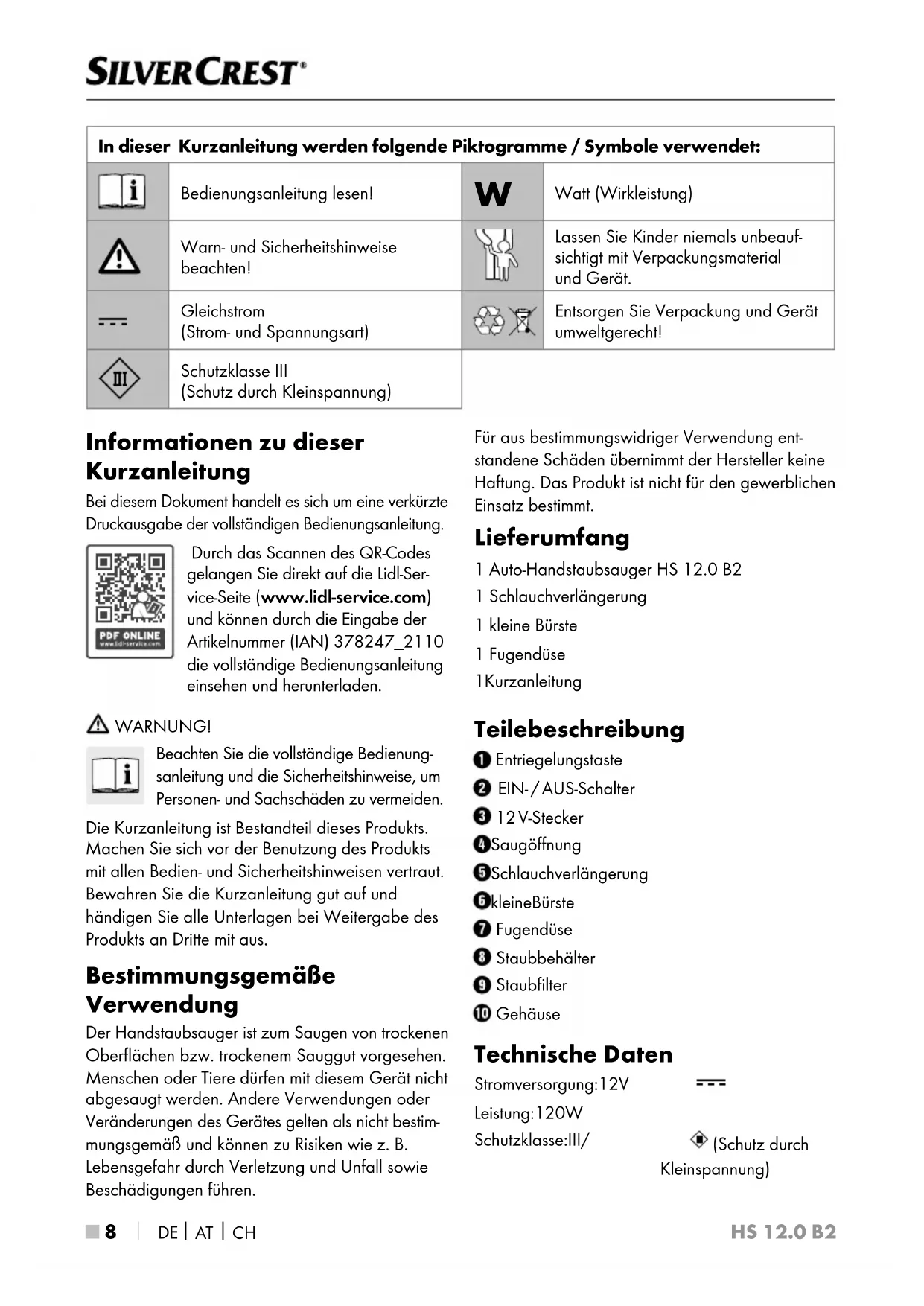 Informationen zu dieser Kurzanleitung Bei diesem Dokument handelt es sich um eine verkürzte Druckausgabe der vollständigen Bedienungsanleitung. Durch das Scannen des QR-Codes gelangen Sie direkt auf die Lidl-Ser- vice-Seite (www.lidl-service.com) und können durch die Eingabe der Artikelnummer (IAN) 378247_2110 die vollständige Bedienungsanleitung einsehen und herunterladen. WARNUNG! Beachten Sie die vollständige Bedienung- sanleitung und die Sicherheitshinweise, um Personen- und Sachschäden zu vermeiden. Die Kurzanleitung ist Bestandteil dieses Produkts. Machen Sie sich vor der Benutzung des Produkts mit allen Bedien- und Sicherheitshinweisen vertraut. Bewahren Sie die Kurzanleitung gut auf und händigen Sie alle Unterlagen bei Weitergabe des Produkts an Dritte mit aus. Bestimmungsgemäße Verwendung Der Handstaubsauger ist zum Saugen von trockenen Oberflächen bzw. trockenem Sauggut vorgesehen. Menschen oder Tiere dürfen mit diesem Gerät nicht abgesaugt werden. Andere Verwendungen oder Veränderungen des Gerätes gelten als nicht bestim- mungsgemäß und können zu Risiken wie z.B. Lebensgefahr durch Verletzung und Unfall sowie Beschädigungen führen. Für aus bestimmungswidriger Verwendung ent- standene Schäden übernimmt der Hersteller keine Haftung. Das Produkt ist nicht für den gewerblichen Einsatz bestimmt. Lieferumfang 1 Auto-Handstaubsauger HS 12.0 B2 1 Schlauchverlängerung 1 kleine Bürste 1 Fugendüse 1 Kurzanleitung Teilebeschreibung Entriegelungstaste EIN- / AUS-Schalter 12 V-Stecker Saugöffnung Schlauchverlängerung kleine Bürste Fugendüse Staubbehälter Staubfilter Gehäuse Technische Daten Stromversorgung: 12 V Leistung: 120 W Schutzklasse: III / (Schutz durch Kleinspannung) In dieser Kurzanleitung werden folgende Piktogramme / Symbole verwendet: Bedienungsanleitung lesen!