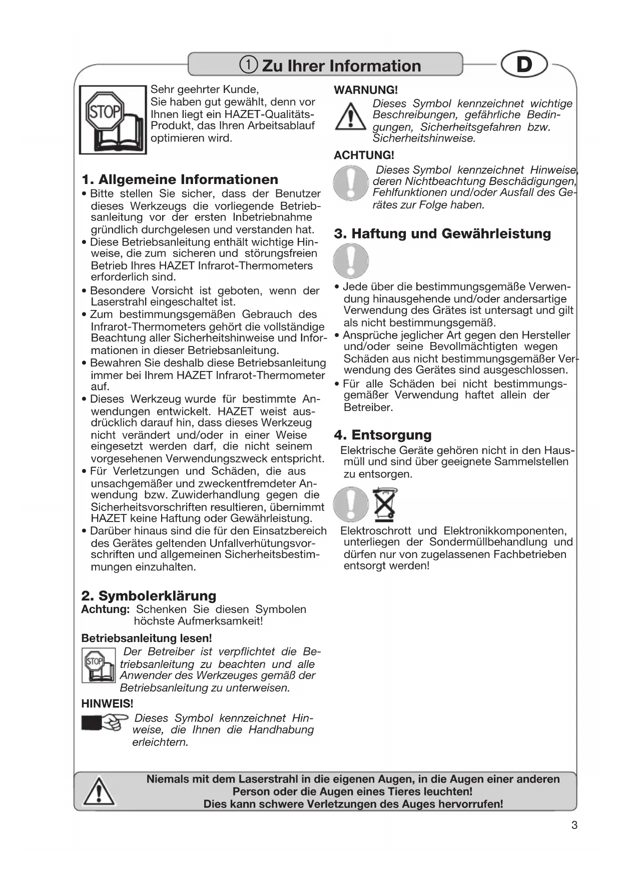 Niemals mit dem Laserstrahl in die eigenen Augen, in die Augen einer anderen Person oder die Augen eines Tieres leuchten! Dies kann schwere Verletzungen des Auges hervorrufen! Sehr geehrter Kunde, Sie haben gut gewählt, denn vor Ihnen liegt ein HAZET-Qualitäts- Produkt, das Ihren Arbeitsablauf optimieren wird.