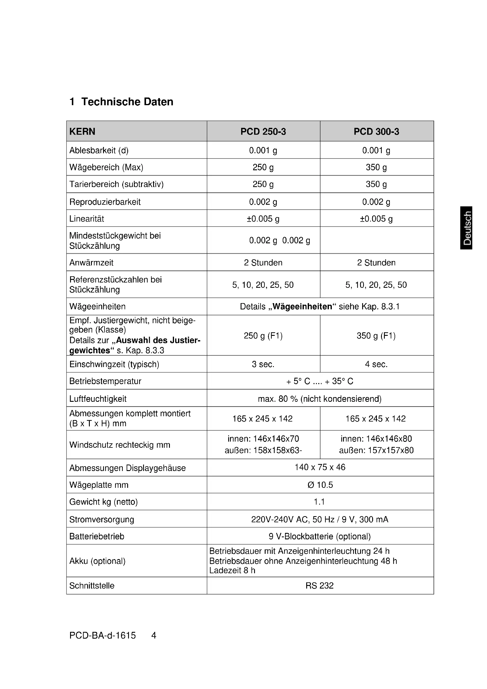 Anwärmzeit 2 Stunden 2 Stunden Referenzstückzahlen bei Stückzählung 5, 10, 20, 25, 50 Wägeeinheiten Details „Wägeeinheiten“ siehe Kap. 8.3.1 Empf. Justiergewicht, nicht beige- geben (Klasse) Details zur „Auswahl des Justier- gewichtes“ s. Kap. 8.3.3 2500 g (F1) 3 kg (F1) Einschwingzeit (typisch) 3 sec. Betriebstemperatur + 5° C .... + 35° C Luftfeuchtigkeit max. 80 % (nicht kondensierend) Abmessungen komplett montiert (B x T x H) mm 165 x 280 x 73 Abmessungen Displaygehäuse 140 x 75 x 46 Wägeplatte mm 160 x 160 Gewicht kg (netto) 1.6 1.9 Stromversorgung 220V-240V AC, 50 Hz / 9 V, 300 mA Batteriebetrieb 9 V-Blockbatterie (optional) Akku (optional) Betriebsdauer mit Anzeigenhinterleuchtung 24 h Betriebsdauer ohne Anzeigenhinterleuchtung 48 h Ladezeit 8 h Schnittstelle RS 232PCD-BA-d-1615 6 KERN PCD 6K-4 PCD 10K0.1 PCD 10K3 Ablesbarkeit (d) 0.1 g 0.1 g 1 g Wägebereich (Max) 6000 g 10 kg 10 kg Tarierbereich (subtraktiv) 6000 g 10 kg 10 kg Reproduzierbarkeit 0.1 g 0.1 g 1 g Linearität ±0.3 g ±0.3 g ±3 g Mindeststückgewicht bei Stückzählung