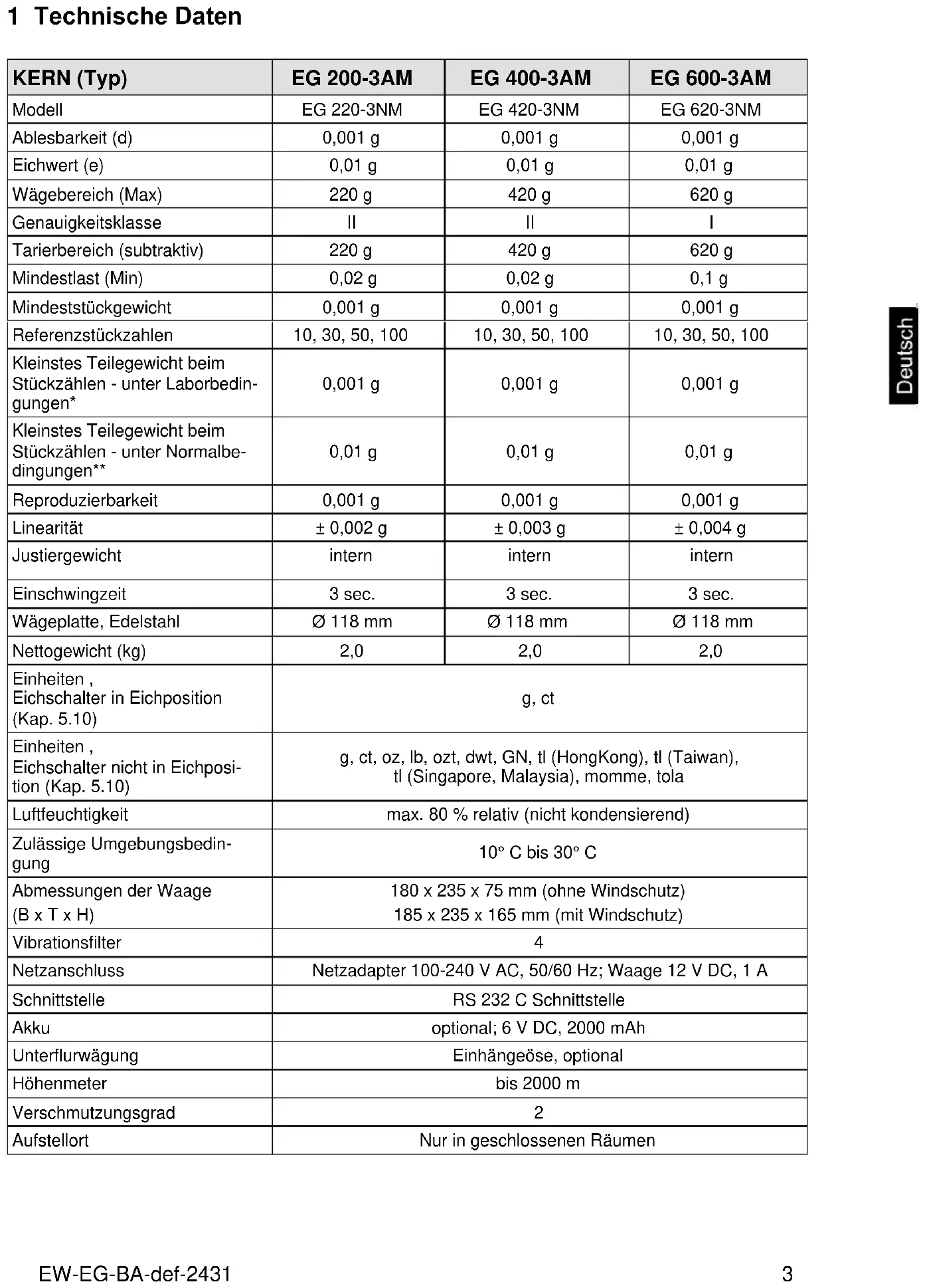 1 Technische Daten KERN (Typ) EG 200-3AM EG 400-3AM EG 600-3AM Modell EG 220-3NM EG 420-3NM EG 620-3NM Ablesbarkeit (d) 0,001 g 0,001 g 0,001 g Eichwert (e) 0,01 g 0,01 g 0,01 g Wägebereich (Max) 220 g 420 g 620 g Genauigkeitsklasse