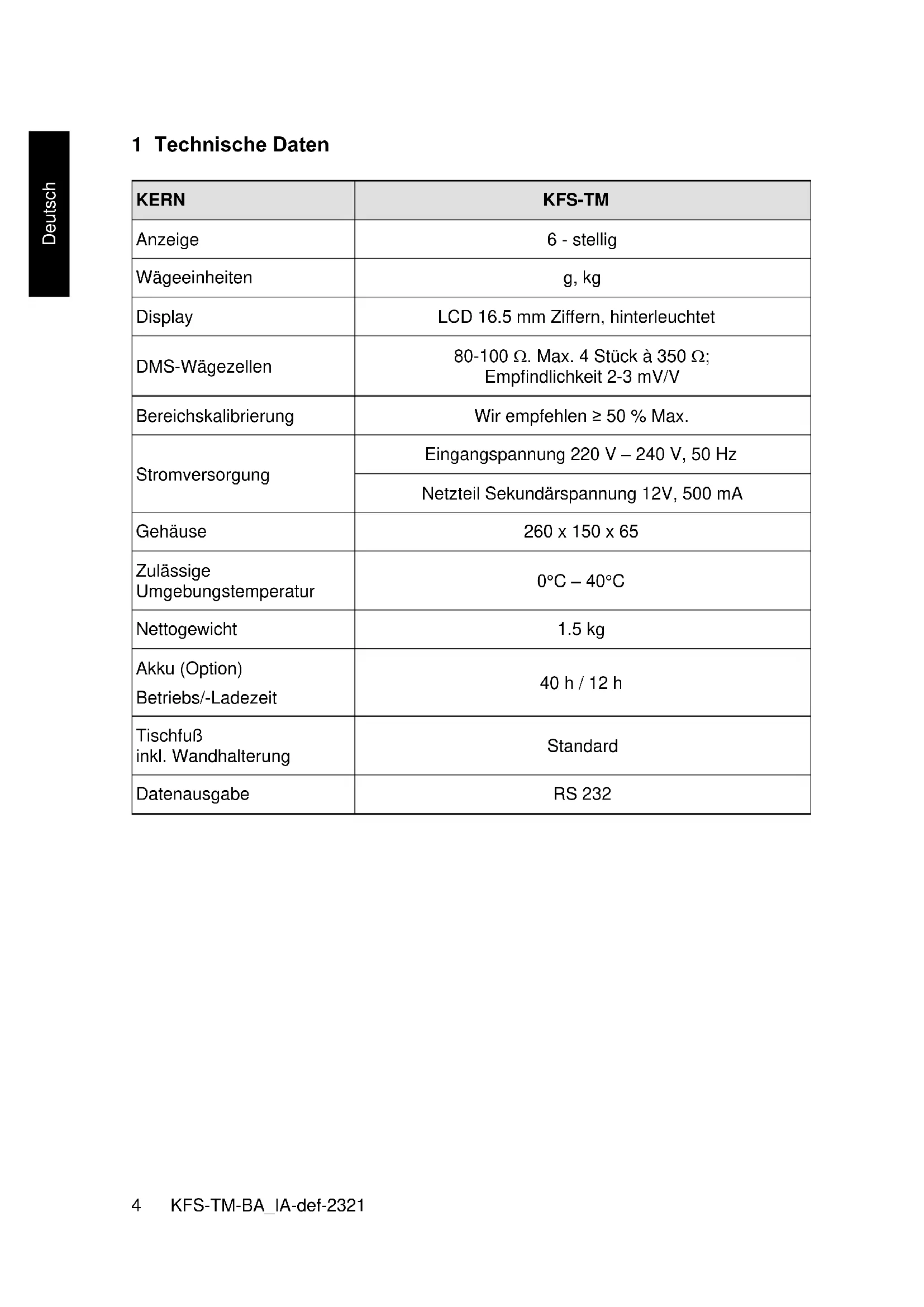 - Die Waage darf nur gemäß den beschriebenen Vorgaben eingesetzt werden. Abweichende Einsatzbereiche/Anwendungsgebiete sind von KERN schriftlich freizugeben.10 KFS-TM-BA_IA-def-2321 Deutsch
