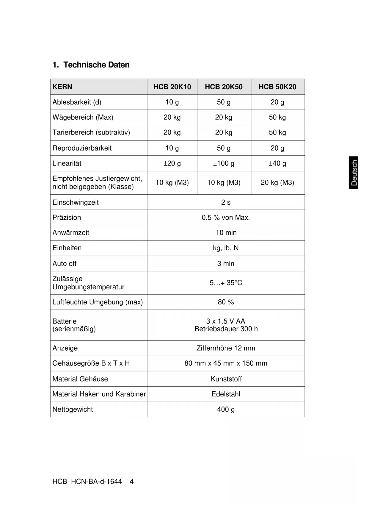 Edelstahl Nettogewicht 400 g5 HCB_HCN-BA-d-1644 KERN HCB 50K100 HCB 99K50 HCB 100K200 Ablesbarkeit (d) 100 g 50 g 200 g Wägebereich (Max) 50 kg 99 kg 100 kg Tarierbereich (subtraktiv) 20 kg 20 kg 50 kg Reproduzierbarkeit 100 g 50 g 200 g Linearität ±200 g ±100 g ±400 g Empfohlenes Justiergewicht, nicht beigegeben (Klasse) 20 kg (M3) 50 kg (M3) 50 kg (M3) Einschwingzeit 2 s Präzision 0.5 % von Max. Anwärmzeit 10 min Einheiten kg, lb, N Auto off 3 min Zulässige Umgebungstemperatur 5…+35 °C Luftfeuchte Umgebung (max) 80 % Batterie (serienmäßig) 3 x 1.5 V AA Betriebsdauer 300 h Anzeige Ziffernhöhe 12 mm Gehäusegröße B x T x H 80 mm x 45 mm x 150 mm Material Gehäuse Kunststoff Material Haken und Karabiner