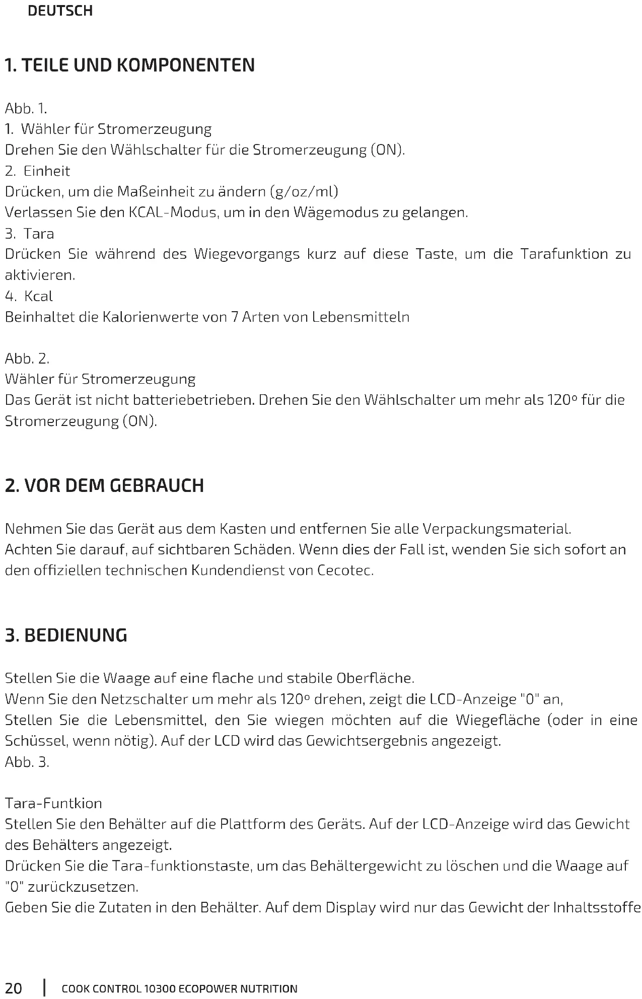 Stellen Sie die Waage auf eine ache und stabile Oberäche. Wenn Sie den Netzschalter um mehr als 120º drehen, zeigt die LCD-Anzeige "0" an, Stellen Sie die Lebensmittel, den Sie wiegen möchten auf die Wiegeäche (oder in eine Schüssel, wenn nötig). Auf der LCD wird das Gewichtsergebnis angezeigt. Abb. 3. Tara-Funtkion Stellen Sie den Behälter auf die Plattform des Geräts. Auf der LCD-Anzeige wird das Gewicht des Behälters angezeigt. Drücken Sie die Tara-funktionstaste, um das Behältergewicht zu löschen und die Waage auf "0" zurückzusetzen. Geben Sie die Zutaten in den Behälter. Auf dem Display wird nur das Gewicht der InhaltsstoffeCOOK CONTROL 10300 ECOPOWER NUTRITION