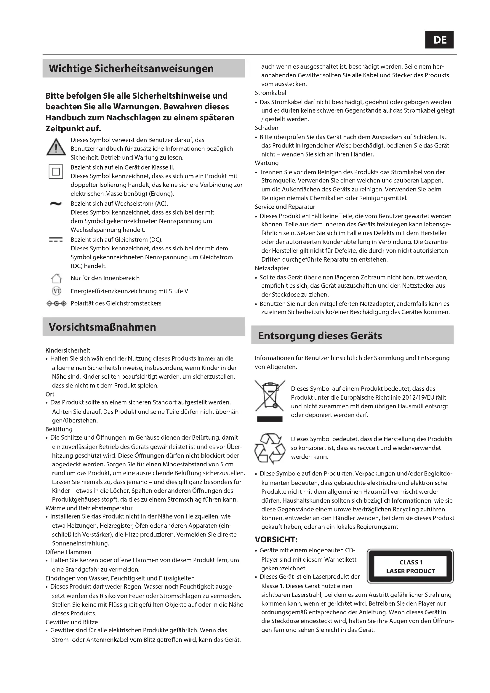 - Dieses Gerät ist ein Laserprodukt der Klasse1. Dieses Gerät nutzt einen sichtbaren Laserstrahl, bei dem es zum Austritt gefährlicher Strahlung kommen kann, wenn er gerichtet wird. Betreiben Sie den Player nur ordnungsgemäß entsprechend der Anleitung. Wenn dieses Gerät in die Steckdose eingesteckt wird, halten Sie ihre Augen von den Önun- gen fern und sehen Sie nicht in das Gerät. CLASS 1 LASER PRODUCT11