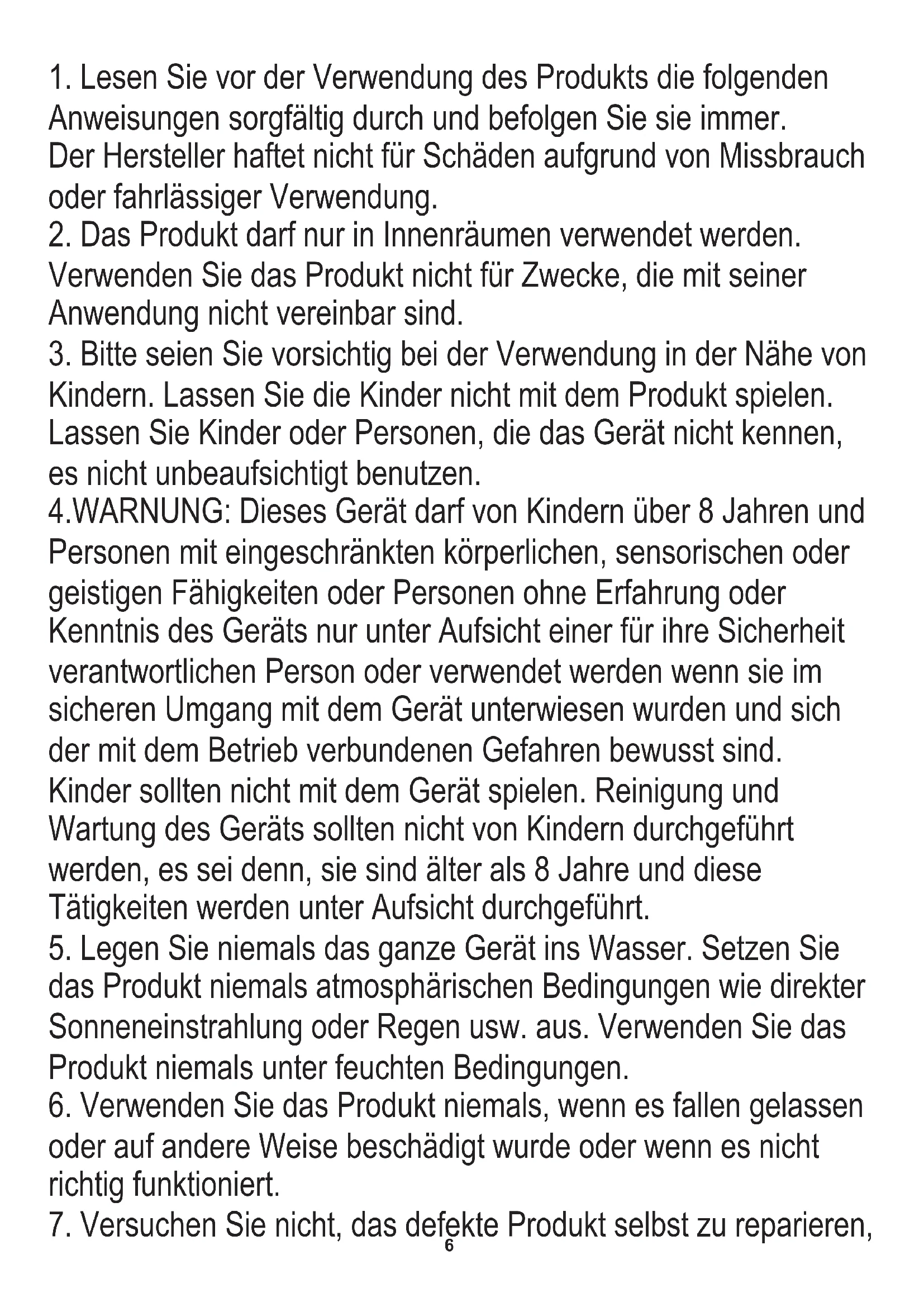 4.WARNUNG: Dieses Gerät darf von Kindern über 8 Jahren und Personen mit eingeschränkten körperlichen, sensorischen oder geistigen Fähigkeiten oder Personen ohne Erfahrung oder Kenntnis des Geräts nur unter Aufsicht einer für ihre Sicherheit verantwortlichen Person oder verwendet werden wenn sie im sicheren Umgang mit dem Gerät unterwiesen wurden und sich der mit dem Betrieb verbundenen Gefahren bewusst sind. Kinder sollten nicht mit dem Gerät spielen. Reinigung und Wartung des Geräts sollten nicht von Kindern durchgeführt werden, es sei denn, sie sind älter als 8 Jahre und diese Tätigkeiten werden unter Aufsicht durchgeführt.