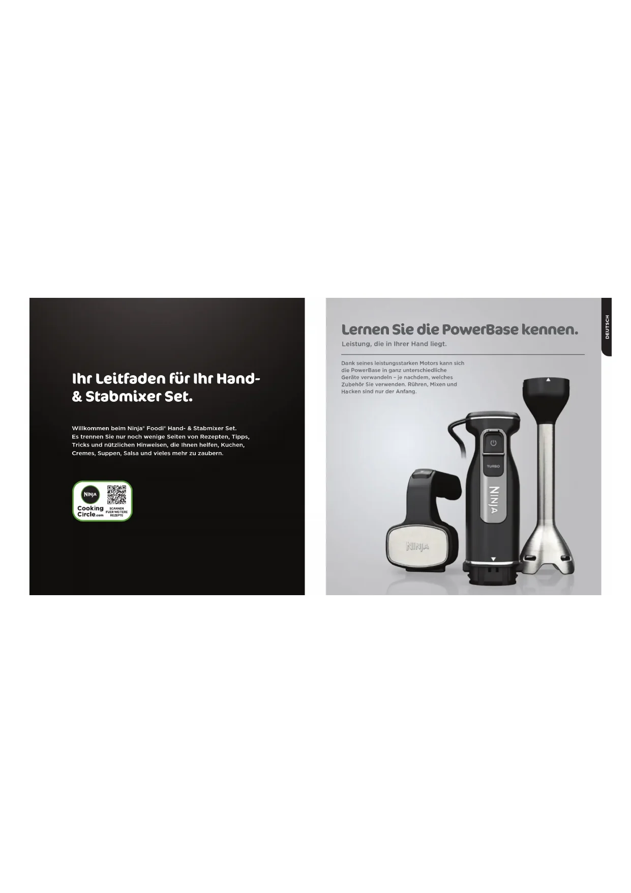 ground about 10 seconds. ENGLISHIhr Leitfaden für Ihr Hand- & Stabmixer Set. Willkommen beim Ninja® Foodi® Hand- & Stabmixer Set. Es trennen Sie nur noch wenige Seiten von Rezepten, Tipps, Tricks und nützlichen Hinweisen, die Ihnen helfen, Kuchen, Cremes, Suppen, Salsa und vieles mehr zu zaubern. Dank seines leistungsstarken Motors kann sich die PowerBase in ganz unterschiedliche Geräte verwandeln – je nachdem, welches Zubehör Sie verwenden. Rühren, Mixen und Hacken sind nur der Anfang. Lernen Sie die PowerBase kennen. Leistung, die in Ihrer Hand liegt. DEUTSCH31ninjakitchen.euninjakitchen.eu Handmixer Lernen Sie Ihren Handmixer kennen Wenn Sie die Rührbesen eingesetzt haben, verwenden Sie die Geschwindigkeitsstufe 1 zum Einrühren von trockenen Zutaten in Flüssigkeiten. Steigern Sie die Geschwindigkeit auf die Stufen 3–4, um Keksteig, Cremes, Brotteig, Glasuren oder Kartoelpüree zuzubereiten. Die Geschwindigkeitsstufe 4 eignet sich zum Aufschlagen von Butter und Zucker. Die Verwendung für Hefeteige wie Pizza oder Gebäck wird nicht empfohlen. Rührbesen: Geschwindigkeitsstufen 1–5 Knethaken: Geschwindigkeitsstufen 1–4 Verwenden Sie bei eingesetzten Knethaken die Geschwindigkeitsstufen 1–2, um die trockenen und flüssigen Zutaten zu mischen, und erhöhen Sie dann langsam auf die Geschwindigkeitsstufe 4, um den Teig zu kneten. Halten Sie sich genau an die im Rezept vorgegebenen Rührzeiten. Achten Sie auch genau auf visuelle Hinweise, die Ihnen helfen zu entscheiden, wie lange Sie schlagen, mixen oder aufschlagen. Wenn im Rezept zum Beispiel steht „mixen, bis sich steife Spitzen bilden“, dann kontrollieren Sie die Mischung immer wieder, um festzustellen, ob sich steife Spitzen herausbilden.Beginnen Sie immer auf der Geschwindigkeitsstufe 1 und steigern Sie die Geschwindigkeit ganz langsam, um ein Umherspritzen der Zutaten zu verhindern. Wenn Sie die Arbeit beenden, denken Sie daran, das Gerät auszuschalten. DEUTSCH Beginnen Sie mit dem Mischenninjakitchen.eu Der Behälter sollte ausreichend groß sein, damit der Mixerkopf ganz in die Zutaten eingetaucht werden kann. Wenn der Mixerkopf eingetaucht ist, sollte noch genügend Platz in dem Behälter sein, um Überlaufen und Spritzen zu verhindern. Es empfiehlt sich, einen Kochtopf oder einen großen Messbecher zu erwenden. HINWEIS: Führen Sie den Mixvorgang nicht in Töpfen und Pfannen mit Antihaftbeschichtung durch. Tauchen Sie die Önungen am Mixerkopf in die Zutaten ein und drehen Sie die Klinge nach oben und von Ihnen weg. Führen Sie das Gerät beim Mixvorgang leicht nach oben und nach unten und unterbrechen Sie die Arbeit, wenn die Önungen nicht mehr von den Zutaten bedeckt sind. Auswahl des Behälters Mixen und Pürieren Beginnen sie mit dem Mixen Tipps zum Mixvorgang: