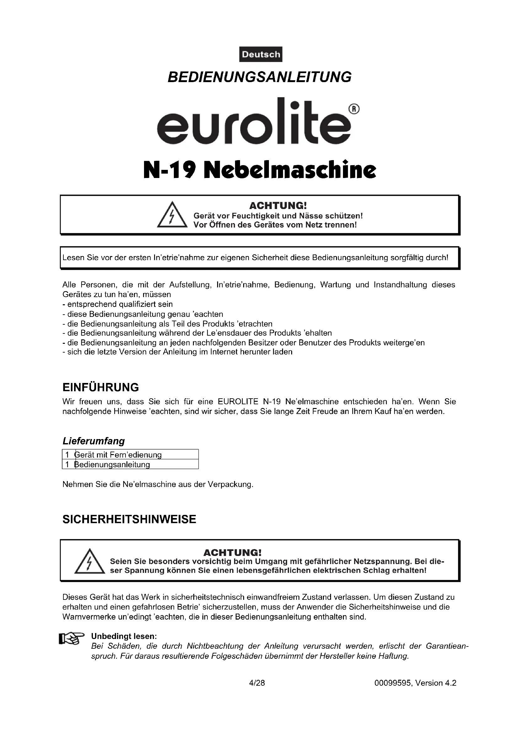 Lesen Sie vor der ersten Inbetriebnahme zur eigenen Sicherheit diese Bedienungsanleitung sorgfältig durch! Alle Personen, die mit der Aufstellung, Inbetriebnahme, Bedienung, Wartung und Instandhaltung dieses Gerätes zu tun haben, müssen - entsprechend qualifiziert sein - diese Bedienungsanleitung genau beachten - die Bedienungsanleitung als Teil des Produkts betrachten - die Bedienungsanleitung während der Lebensdauer des Produkts behalten - die Bedienungsanleitung an jeden nachfolgenden Besitzer oder Benutzer des Produkts weitergeben - sich die letzte Version der Anleitung im Internet herunter laden EINFÜHRUNG Wir freuen uns, dass Sie sich für eine EUROLITE N-19 Nebelmaschine entschieden haben. Wenn Sie nachfolgende Hinweise beachten, sind wir sicher, dass Sie lange Zeit Freude an Ihrem Kauf haben werden. Lieferumfang 1 Gerät mit Fernbedienung 1 Bedienungsanleitung Nehmen Sie die Nebelmaschine aus der Verpackung. SICHERHEITSHINWEISE