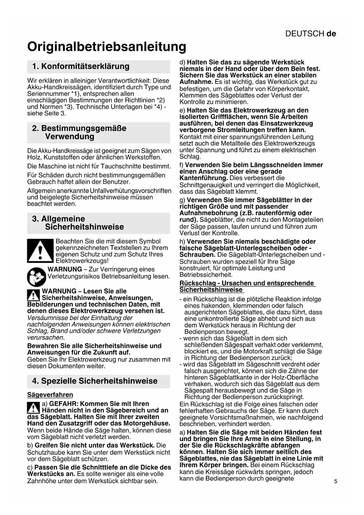 Originalbetriebsanleitung Wir erklären in alleiniger Verantwortlichkeit: Diese Akku-Handkreissägen, identifiziert durch Type und Seriennummer *1), entsprechen allen einschlägigen Bestimmungen der Richtlinien *2) und Normen *3). Technische Unterlagen bei *4) - siehe Seite 3. Die Akku-Handkreissäge ist geeignet zum Sägen von Holz, Kunststoffen oder ähnlichen Werkstoffen. Die Maschine ist nicht für Tauchschnitte bestimmt. Für Schäden durch nicht bestimmungsgemäßen Gebrauch haftet allein der Benutzer. Allgemein anerkannte Unfallverhütungsvorschriften und beigelegte Sicherheitshinweise müssen beachtet werden. Beachten Sie die mit diesem Symbol gekennzeichneten Textstellen zu Ihrem eigenen Schutz und zum Schutz Ihres Elektrowerkzeugs! WARNUNG – Zur Verringerung eines Verletzungsrisikos Betriebsanleitung lesen. WARNUNG – Lesen Sie alle Sicherheitshinweise, Anweisungen, Bebilderungen und technischen Daten, mit denen dieses Elektrowerkzeug versehen ist. Versäumnisse bei der Einhaltung der nachfolgenden Anweisungen können elektrischen Schlag, Brand und/oder schwere Verletzungen verursachen. Bewahren Sie alle Sicherheitshinweise und Anweisungen für die Zukunft auf. Geben Sie Ihr Elektrowerkzeug nur zusammen mit diesen Dokumenten weiter. Sägeverfahren a) GEFAHR: Kommen Sie mit Ihren Händen nicht in den Sägebereich und an das Sägeblatt. Halten Sie mit Ihrer zweiten Hand den Zusatzgriff oder das Motorgehäuse. Wenn beide Hände die Säge halten, können diese vom Sägeblatt nicht verletzt werden. b) Greifen Sie nicht unter das Werkstück. Die Schutzhaube kann Sie unter dem Werkstück nicht vor dem Sägeblatt schützen. c) Passen Sie die Schnitttiefe an die Dicke des Werkstücks an. Es sollte weniger als eine volle Zahnhöhe unter dem Werkstück sichtbar sein. d) Halten Sie das zu sägende Werkstück niemals in der Hand oder über dem Bein fest. Sichern Sie das Werkstück an einer stabilen Aufnahme. Es ist wichtig, das Werkstück gut zu befestigen, um die Gefahr von Körperkontakt, Klemmen des Sägeblattes oder Verlust der Kontrolle zu minimieren. e) Halten Sie das Elektrowerkzeug an den isolierten Griffflächen, wenn Sie Arbeiten ausführen, bei denen das Einsatzwerkzeug verborgene Stromleitungen treffen kann. Kontakt mit einer spannungsführenden Leitung setzt auch die Metallteile des Elektrowerkzeugs unter Spannung und führt zu einem elektrischen Schlag. f) Verwenden Sie beim Längsschneiden immer einen Anschlag oder eine gerade Kantenführung. Dies verbessert die Schnittgenauigkeit und verringert die Möglichkeit, dass das Sägeblatt klemmt. g) Verwenden Sie immer Sägeblätter in der richtigen Größe und mit passender Aufnahmebohrung (z.B. rautenförmig oder rund). Sägeblätter, die nicht zu den Montageteilen der Säge passen, laufen unrund und führen zum Verlust der Kontrolle. h) Verwenden Sie niemals beschädigte oder falsche Sägeblatt-Unterlegscheiben oder - Schrauben. Die Sägeblatt-Unterlegscheiben und - Schrauben wurden speziell für Ihre Säge konstruiert, für optimale Leistung und Betriebssicherheit. Rückschlag - Ursachen und entsprechende Sicherheitshinweise - ein Rückschlag ist die plötzliche Reaktion infolge eines hakenden, klemmenden oder falsch ausgerichteten Sägeblattes, die dazu führt, dass eine unkontrollierte Säge abhebt und sich aus dem Werkstück heraus in Richtung der Bedienperson bewegt. - wenn sich das Sägeblatt in dem sich schließenden Sägespalt verhakt oder verklemmt, blockiert es, und die Motorkraft schlägt die Säge in Richtung der Bedienperson zurück; - wird das Sägeblatt im Sägeschnitt verdreht oder falsch ausgerichtet, können sich die Zähne der hinteren Sägeblattkante in der Holz-Oberfläche verhaken, wodurch sich das Sägeblatt aus dem Sägespalt herausbewegt und die Säge in Richtung der Bedienperson zurückspringt. Ein Rückschlag ist die Folge eines falschen oder fehlerhaften Gebrauchs der Säge. Er kann durch geeignete Vorsichtsmaßnahmen, wie nachfolgend beschrieben, verhindert werden. a) Halten Sie die Säge mit beiden Händen fest und bringen Sie Ihre Arme in eine Stellung, in der Sie die Rückschlagkräfte abfangen können. Halten Sie sich immer seitlich des Sägeblattes, nie das Sägeblatt in eine Linie mit Ihrem Körper bringen. Bei einem Rückschlag kann die Kreissäge rückwärts springen, jedoch kann die Bedienperson durch geeignete