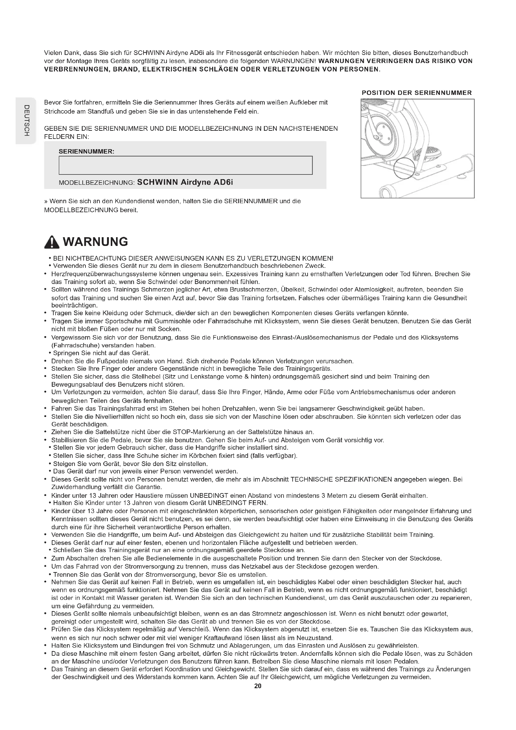 Vielen Dank, dass Sie sich für SCHWINN Airdyne AD6i als Ihr Fitnessgerät entschieden haben. Wir möchten Sie bitten, diese Benutzerhandbuch vor der Montage Ihres Geräts sorgfältig zulesen, insbesondere die folgenden WARNUNGEN! WARNUNGEN VERRINGERN DAS RISIKO VON VERBRENNUGEN, BRAND, ELEKTRISCHEN SCHLAGEN ODER VERLETZUNGEN VON PERSONEN.