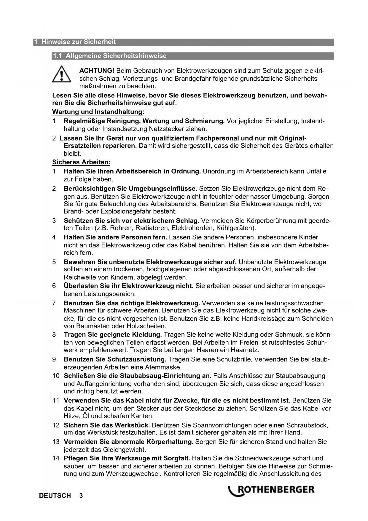 ACHTUNG! Beim Gebrauch von Elektrowerkzeugen sind zum Schutz gegen elektri- schen Schlag, Verletzungs- und Brandgefahr folgende grundsätzliche Sicherheits- maßnahmen zu beachten. Lesen Sie alle diese Hinweise, bevor Sie dieses Elektrowerkzeug benutzen, und bewah- ren Sie die Sicherheitshinweise gut auf. Wartung und Instandhaltung: 1 Regelmäßige Reinigung, Wartung und Schmierung. Vor jeglicher Einstellung, Instand- haltung oder Instandsetzung Netzstecker ziehen. 2 Lassen Sie Ihr Gerät nur von qualifiziertem Fachpersonal und nur mit Original- Ersatzteilen reparieren. Damit wird sichergestellt, dass die Sicherheit des Gerätes erhalten bleibt. Sicheres Arbeiten: 1 Halten Sie Ihren Arbeitsbereich in Ordnung. Unordnung im Arbeitsbereich kann Unfälle zur Folge haben. 2 Berücksichtigen Sie Umgebungseinflüsse. Setzen Sie Elektrowerkzeuge nicht dem Re- gen aus. Benützen Sie Elektrowerkzeuge nicht in feuchter oder nasser Umgebung. Sorgen Sie für gute Beleuchtung des Arbeitsbereichs. Benutzen Sie Elektrowerkzeuge nicht, wo Brand- oder Explosionsgefahr besteht. 3 Schützen Sie sich vor elektrischem Schlag. Vermeiden Sie Körperberührung mit geerde- ten Teilen (z.B. Rohren, Radiatoren, Elektroherden, Kühlgeräten). 4 Halten Sie andere Personen fern. Lassen Sie andere Personen, insbesondere Kinder, nicht an das Elektrowerkzeug oder das Kabel berühren. Halten Sie sie von dem Arbeitsbe- reich fern. 5 Bewahren Sie unbenutzte Elektrowerkzeuge sicher auf. Unbenutzte Elektrowerkzeuge sollten an einem trockenen, hochgelegenen oder abgeschlossenen Ort, außerhalb der Reichweite von Kindern, abgelegt werden. 6 Überlasten Sie ihr Elektrowerkzeug nicht. Sie arbeiten besser und sicherer im angege- benen Leistungsbereich. 7 Benutzen Sie das richtige Elektrowerkzeug. Verwenden sie keine leistungsschwachen Maschinen für schwere Arbeiten. Benutzen Sie das Elektrowerkzeug nicht für solche Zwe- cke, für die es nicht vorgesehen ist. Benutzen Sie z.B. keine Handkreissäge zum Schneiden von Baumästen oder Holzscheiten. 8 Tragen Sie geeignete Kleidung. Tragen Sie keine weite Kleidung oder Schmuck, sie könn- ten von beweglichen Teilen erfasst werden. Bei Arbeiten im Freien ist rutschfestes Schuh- werk empfehlenswert. Tragen Sie bei langen Haaren ein Haarnetz. 9 Benutzen Sie Schutzausrüstung. Tragen Sie eine Schutzbrille. Verwenden Sie bei staub- erzeugenden Arbeiten eine Atemmaske. 10 Schließen Sie die Staubabsaug-Einrichtung an. Falls Anschlüsse zur Staubabsaugung und Auffangeinrichtung vorhanden sind, überzeugen Sie sich, dass diese angeschlossen und richtig benutzt werden. 11 Verwenden Sie das Kabel nicht für Zwecke, für die es nicht bestimmt ist. Benützen Sie das Kabel nicht, um den Stecker aus der Steckdose zu ziehen. Schützen Sie das Kabel vor Hitze, Öl und scharfen Kanten. 12 Sichern Sie das Werkstück. Benützen Sie Spannvorrichtungen oder einen Schraubstock, um das Werkstück festzuhalten. Es ist damit sicherer gehalten als mit Ihrer Hand. 13 Vermeiden Sie abnormale Körperhaltung. Sorgen Sie für sicheren Stand und halten Sie jederzeit das Gleichgewicht. 14 Pflegen Sie Ihre Werkzeuge mit Sorgfalt. Halten Sie die Schneidwerkzeuge scharf und sauber, um besser und sicherer arbeiten zu können. Befolgen Sie die Hinweise zur Schmie- rung und zum Werkzeugwechsel. Kontrollieren Sie regelmäßig die Anschlussleitung des4 DEUTSCH Elektrowerkzeugs und lassen Sie diese bei Beschädigung von einem anerkannten Fach- mann erneuern. Kontrollieren Sie die Verlängerungsleitungen regelmäßig und ersetzen Sie diese, wenn sie beschädigt sind. Halten Sie Handgriffe trocken, sauber und frei von Fett und Öl. 15 Ziehen Sie den Stecker aus der Steckdose. Bei Nichtgebrauch des Elektrowerkzeugs, vor der Wartung und beim Wechsel von Werkzeugen wie z. B. Sägeblatt, Bohrer, Fräser. 16 Lassen Sie keine Werkzeugschlüssel stecken. Überprüfen Sie vor dem Einschalten, dass Schlüssel und Einstellwerkzeug entfernt sind. 17 Vermeiden Sie unbeabsichtigten Anlauf. Vergewissern Sie sich, dass der Schalter beim Einstecken des Steckers in die Steckdose ausgeschaltet ist. 18 Benutzen Sie Verlängerungskabel für den Außenbereich. Verwenden Sie im Freien nur dafür zugelassene und entsprechend gekennzeichnete Verlängerungskabel. 19 Seien Sie Aufmerksam. Achten Sie darauf, was Sie tun. Gehen Sie mit Vernunft an die Ar- beit. Benutzen Sie das Elektrowerkzeug nicht, wenn Sie unkonzentriert sind. 20 Überprüfen Sie das Elektrowerkzeug auf eventuelle Beschädigungen. Vor weiterem Gebrauch des Elektrowerkzeugs müssen Schutzvorrichtungen oder leicht beschädigte Teile sorgfältig auf ihre einwandfreie und bestimmungsgemäße Funktion untersucht werden. Überprüfen Sie, ob die beweglichen Teile einwandfrei funktionieren und nicht klemmen oder ob Teile beschädigt sind. Sämtliche Teile müssen richtig montiert sein und alle Bedingungen erfüllen, um den einwandfreien Betrieb des Elektrowerkzeugs zu gewährleisten. Beschädigte Schutzvorrichtungen und Teile müssen bestimmungsgemäß durch eine aner- kannte Fachwerkstatt repariert oder ausgewechselt werden, soweit nichts anderes in der Gebrauchsanweisung angegeben ist. Beschädigte Schalter müssen bei einer Kundenwerk- statt ersetzt werden. Benutzen Sie keine Elektrowerkzeuge, bei denen sich der Schalter nicht ein- und ausschal- ten lässt. 21 Achtung. Der Gebrauch anderer Einsatzwerkzeuge und anderen Zubehörs kann Verlet- zungsgefahr für Sie bedeuten. 22 Lassen Sie ihr Elektrowerkzeug durch eine Elektrofachkraft reparieren. Dieses Elekt- rowerkzeug entspricht den einschlägigen Sicherheitsbestimmungen. Reparaturen dürfen nur von einer Elektrofachkraft ausgeführt werden, indem Original Ersatzteile verwendet werden; andernfalls können Unfälle für den Benutzer entstehen.