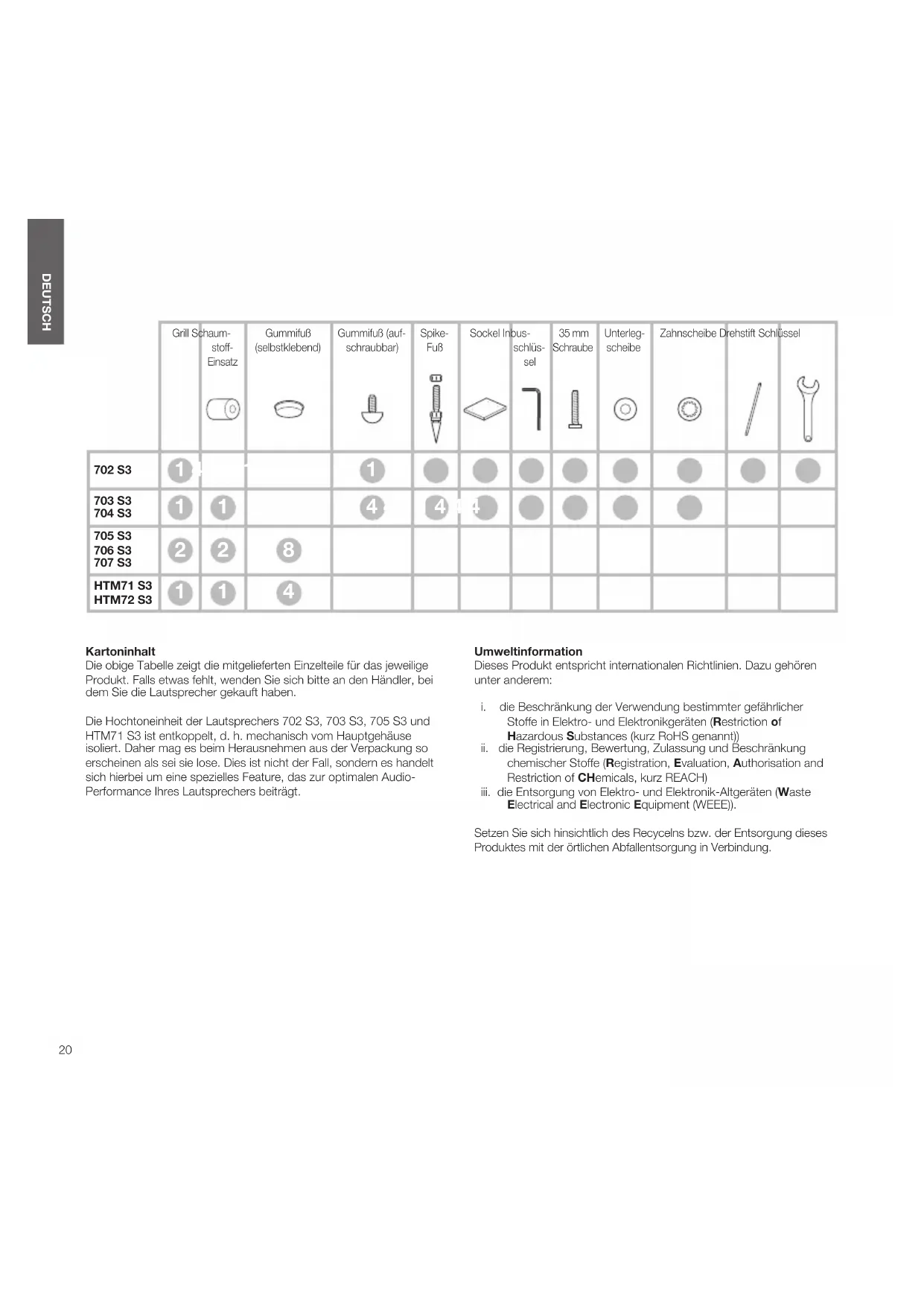 DEUTSCH Kartoninhalt Die obige Tabelle zeigt die mitgelieferten Einzelteile für das jeweilige Produkt. Falls etwas fehlt, wenden Sie sich bitte an den Händler, bei dem Sie die Lautsprecher gekauft haben. Die Hochtoneinheit der Lautsprechers 702 S3, 703 S3, 705S3 und HTM71 S3 ist entkoppelt, d. h. mechanisch vom Hauptgehäuse isoliert. Daher mag es beim Herausnehmen aus der Verpackung so erscheinen als sei sie lose. Dies ist nicht der Fall, sondern es handelt sich hierbei um eine spezielles Feature, das zur optimalen Audio- Performance Ihres Lautsprechers beiträgt. Umweltinformation Dieses Produkt entspricht internationalen Richtlinien. Dazu gehören unter anderem:
