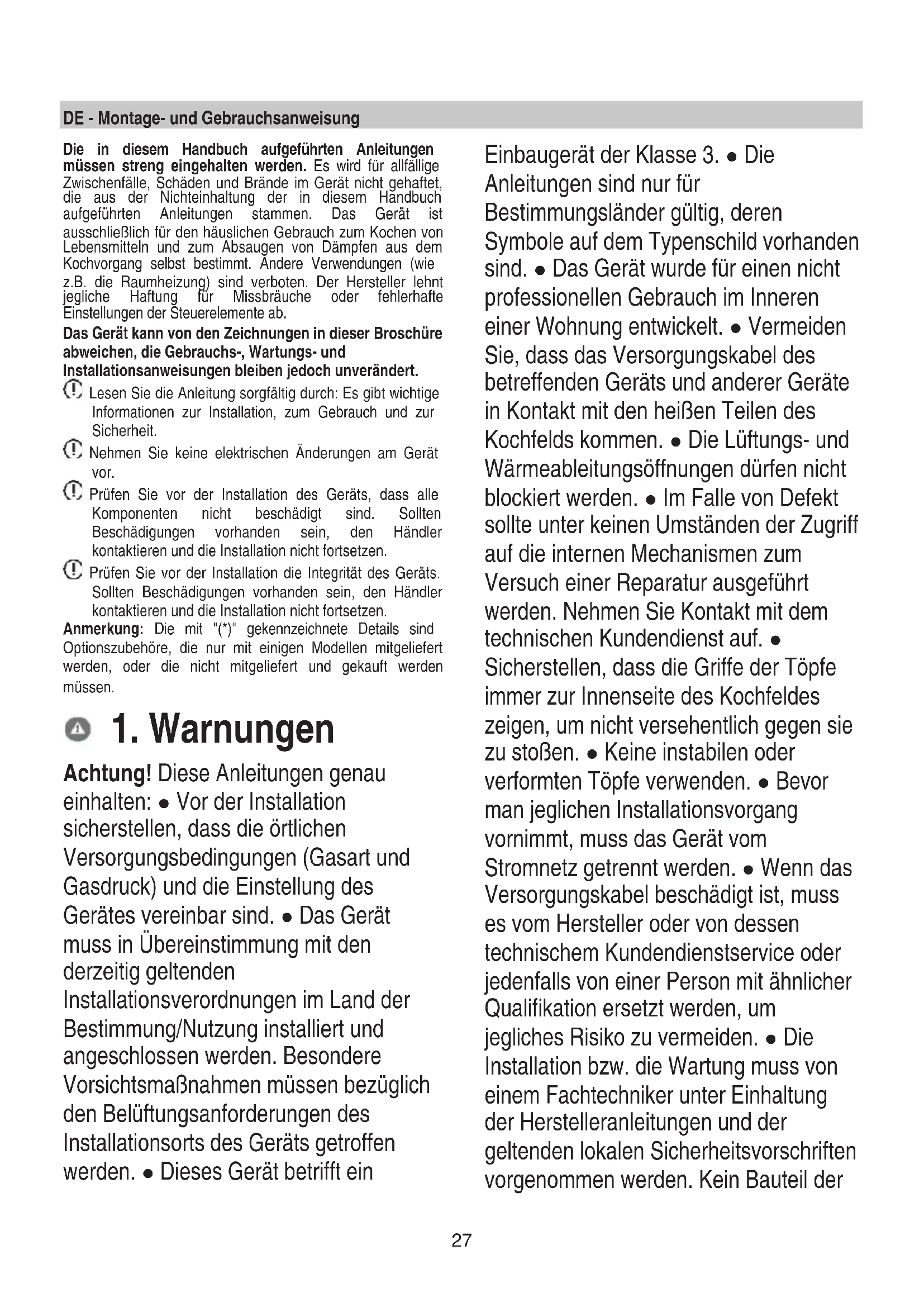 Achtung! Diese Anleitungen genau einhalten: ● Vor der Installation sicherstellen, dass die örtlichen Versorgungsbedingungen (Gasart und Gasdruck) und die Einstellung des Gerätes vereinbar sind. ● Das Gerät muss in Übereinstimmung mit den derzeitig geltenden Installationsverordnungen im Land der Bestimmung/Nutzung installiert und angeschlossen werden. Besondere Vorsichtsmaßnahmen müssen bezüglich den Belüftungsanforderungen des Installationsorts des Geräts getroffen werden. ● Dieses Gerät betrifft ein Einbaugerät der Klasse 3. ● Die Anleitungen sind nur für Bestimmungsländer gültig, deren Symbole auf dem Typenschild vorhanden sind. ● Das Gerät wurde für einen nicht professionellen Gebrauch im Inneren einer Wohnung entwickelt. ● Vermeiden Sie, dass das Versorgungskabel des betreffenden Geräts und anderer Geräte in Kontakt mit den heißen Teilen des Kochfelds kommen. ● Die Lüftungs- und Wärmeableitungsöffnungen dürfen nicht blockiert werden. ● Im Falle von Defekt sollte unter keinen Umständen der Zugriff auf die internen Mechanismen zum Versuch einer Reparatur ausgeführt werden. Nehmen Sie Kontakt mit dem technischen Kundendienst auf. ● Sicherstellen, dass die Griffe der Töpfe immer zur Innenseite des Kochfeldes zeigen, um nicht versehentlich gegen sie zu stoßen. ● Keine instabilen oder verformten Töpfe verwenden. ● Bevor man jeglichen Installationsvorgang vornimmt, muss das Gerät vom Stromnetz getrennt werden. ● Wenn das Versorgungskabel beschädigt ist, muss es vom Hersteller oder von dessen technischem Kundendienstservice oder jedenfalls von einer Person mit ähnlicher Qualifikation ersetzt werden, um jegliches Risiko zu vermeiden. ● Die Installation bzw. die Wartung muss von einem Fachtechniker unter Einhaltung der Herstelleranleitungen und der geltenden lokalen Sicherheitsvorschriften vorgenommen werden. Kein Bauteil der28 Geräts reparieren bzw. ersetzen, wenn nicht spezifisch im Bedienungshandbuch gefordert. ● Die Erdung des Geräts ist obligatorisch. ● Damit die Installation den gültigen Sicherheitsvorschriften entspricht, ist ein normgerechter allpoliger Schalter notwendig, der die vollständige Trennung vom Netz unter den Bedingungen der Überspannungskategorie III gemäß den Installationsregeln gewährleistet. ● Keine Mehrfachsteckdosen oder Verlängerungen verwenden. ● Nachdem die Installation abgeschlossen wurde, dürfen die elektrischen Komponenten für den Benutzer nicht mehr zugänglich sein. ● Das Gerät und seine zugänglichen Teile werden während der Verwendung heiß. Darauf achten, die Heizelemente nicht zu berühren. ● Darauf achten, dass Kinder mit dem Gerät nicht spielen. Kinder fernhalten und überwachen, da die zugänglichen Teile während der Benutzung sehr heiß werden können. ● Die Heizelemente des Geräts während und nach der Benutzung nicht berühren. ● Die Berührung mit Tüchern oder mit anderem entflammbarem Material vermeiden, bis alle Komponenten des Geräts ausreichend abgekühlt sind. ● Kein entflammbares Material auf dem Gerät bzw. in seiner Nähe liegen lassen. ● Überhitzte Fette und Öle fangen leicht Feuer. Besondere Aufmerksamkeit ist beim Kochen von Lebensmitteln geboten, die reich an Fett und Öl sind. ● Wenn die Oberfläche Risse oder Brüche aufweist, das Gerät abschalten, um die Möglichkeit eines Stromschlags zu vermeiden. ● Das Gerät ist nicht dafür bestimmt, durch eine externe Zeitschaltuhr oder ein separates Fernbedienungssystem eingeschaltet zu werden. ● Der Kochvorgang muss überwacht werden. ● NIE versuchen, die Flammen mit Wasser zu löschen. Das Gerät hingegen abschalten und die Flammen z.B. mit einem Topfdeckel oder einer Feuerlöschdecke ersticken. Brandgefahr: Keine Gegenstände auf die Kochfläche stellen. ● Keine Dampfreiniger verwenden. ● Bevor das Gerät an das Stromnetz angeschlossen wird, das Typenschild (am unteren Teil des Geräts) prüfen, um sich zu vergewissern, dass die Spannung und die Leistung mit jenen des Stromnetzes übereinstimmen und dass die Steckdose geeignet ist. Im Zweifelsfall einen qualifizierten Fachelektriker konsultieren. Wichtig: ● Das Kochfeld nach der Verwendung mit dessen Befehlseinrichtung abschalten. ● Um Flüssigkeitsaustritte zu vermeiden, die Wärmezufuhr reduzieren. ● Die Heizelemente mit leeren Töpfen und Pfannen oder ohne Behälter nie eingeschaltet lassen. ● Nach Abschluss des Kochvorgangs den bezüglichen Bereich abschalten. ● Niemals leere Töpfe auf den eingeschalteten Heizelementen lassen. ● Keine Behälter verwenden, die über die Ränder des Kochfelds hinausragen. ● ACHTUNG! Im Falle von Bruch des Kochfelds aus Glas: ● 1) Umgehend alle Brenner ausschalten und das Gerät von der Versorgung trennen. ● 2) Die Oberflächen des Geräts nicht berühren ● 3) Das Gerät nicht29 verwenden. ● ACHTUNG! Die Verwendung des Kochfelds erzeugt Wärme, Feuchtigkeit und Verbrennungsprodukte in dem Raum, in dem es installiert ist. Sicherstellen, dass der Raum gut gelüftet ist, besonders, wenn das Gerät in Betrieb ist. Die Lüftungsöffnungen offen halten oder eine mechanische Lüftungsvorrichtung installieren. ● Der längere und intensive Gebrauch des Geräts kann eine zusätzliche Lüftung (zum Beispiel das Öffnen eines Fensters) oder eine effizientere Lüftung (zum Beispiel durch Erhöhung der Leistungsstufe der mechanischen Lüftungsvorrichtung, falls vorhanden) erfordern. ● ACHTUNG! Das Gerät ist ausschließlich für den Hausgebrauch für das Kochen von Lebensmitteln bestimmt. Andere Verwendungen (wie z.B. die Raumheizung) sind verboten. ● Niemals eine Konserven- oder Blechdose erhitzen, ohne sie vorher geöffnet zu haben: Sie könnte explodieren! ● Die Behälter müssen direkt auf das Kochfeld gestellt werden und zentriert sein. Auf keinen Fall dürfen andere Gegenstände zwischen den Topf und das Kochfeld eingesetzt werden. ● Die Verwendung des Geräts erzeugt Wärme
