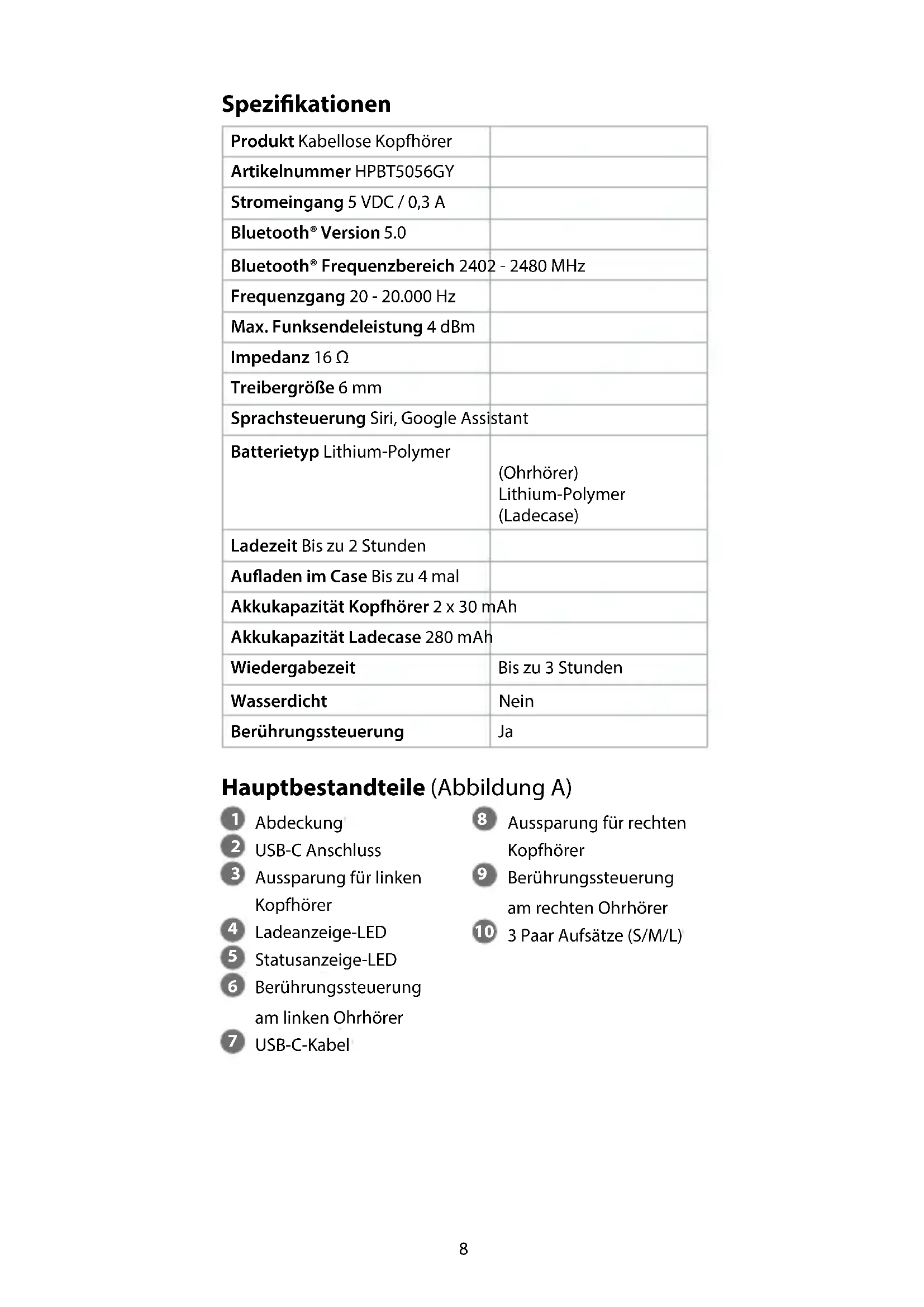 Kurzanleitung Kabellose Kopfhörer HPBT5056GY Weitere Informationen nden Sie in der erweiterten Anleitung online: ned.is/hpbt5056gy Bestimmungsgemäße Verwendung Das Nedis HPBT5056GY ist ein vollständig kabelloses Kopfhörerset. Das Produkt kann mit jedem Bluetooth-fähigen Audio-/ Videogerät gekoppelt werden. Die Ohrhörer können in dem voll aufgeladenen Case bis zu 4 mal mal aufgeladen werden. Jegliche Modikation des Produkts kann Folgen für die Sicherheit, Garantie und ordnungsgemäße Funktionalität haben.8 Spezikationen Produkt Kabellose Kopfhörer Artikelnummer HPBT5056GY Stromeingang 5 VDC / 0,3 A Bluetooth® Version 5.0 Bluetooth® Frequenzbereich 2402 - 2480 MHz Frequenzgang 20 - 20.000 Hz Max. Funksendeleistung 4 dBm Impedanz 16 Ω Treibergröße 6 mm Sprachsteuerung Siri, Google Assistant Batterietyp Lithium-Polymer (Ohrhörer) Lithium-Polymer (Ladecase) Ladezeit Bis zu 2 Stunden Auaden im Case Bis zu 4 mal Akkukapazität Kopfhörer 2 x 30 mAh Akkukapazität Ladecase 280 mAh Wiedergabezeit Bis zu 3 Stunden Wasserdicht Nein Berührungssteuerung Ja Hauptbestandteile (Abbildung A)