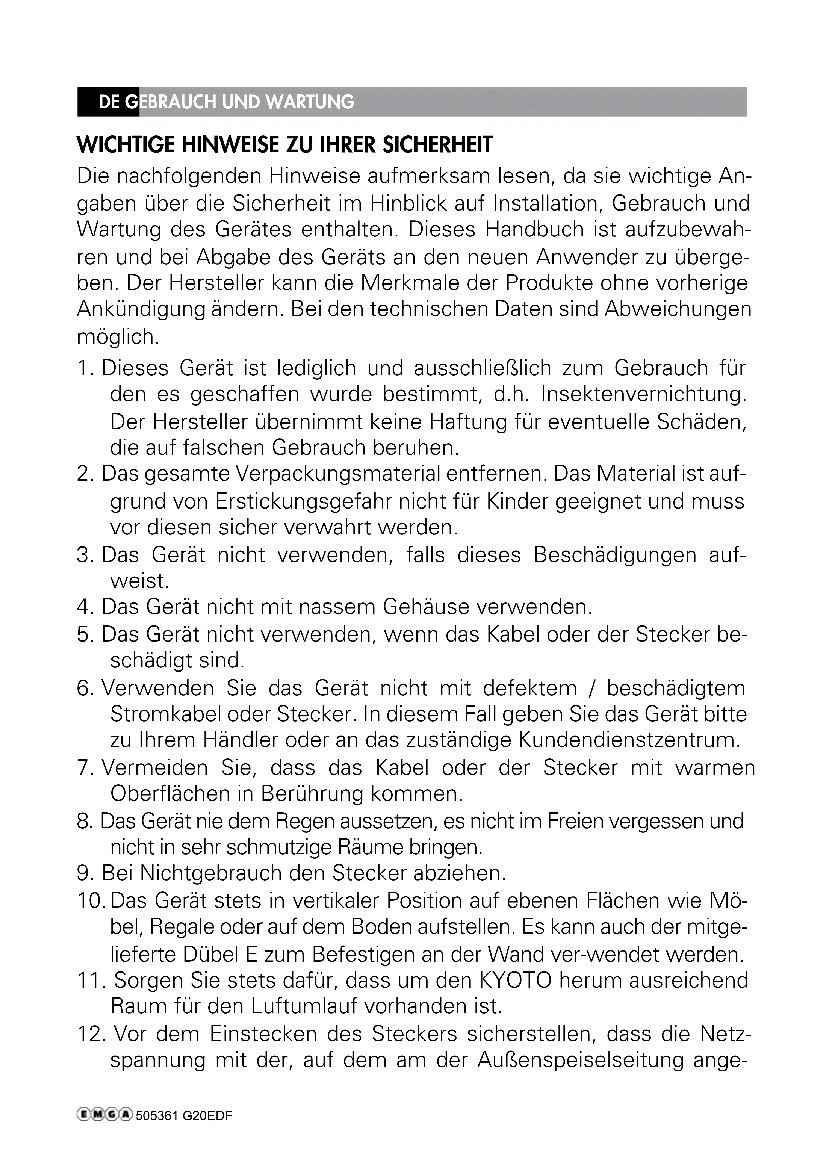 Die UV-Röhren Ihres KYOTO wurden dazu entwickelt, höchstmögli- che Anziehungskraft auf die Fluginsekten auszuüben. Ersetzen Sie diese nicht durch andere handelsübliche Modelle, da sie eine völ- lig andere Wellenlänge haben und Insekten nicht wirksam anziehen. Die Original-Ersatzröhren erhalten Sie bei Ihrem Händler. 505361 G20EDFKUNDENDIENST Haben Sie Probleme oder Fragen bezüglich Ihres KYOTO, wenden Sie sich an Ihren Händler oder an das nächste Kundendienstzentrum. Jegliche Reparatur ist seitens eines zugelassenen Kundendienstzen- trums auszuführen. Hierbei sind nur Original-Ersatzteile zu verwenden! 505361 G20EDF