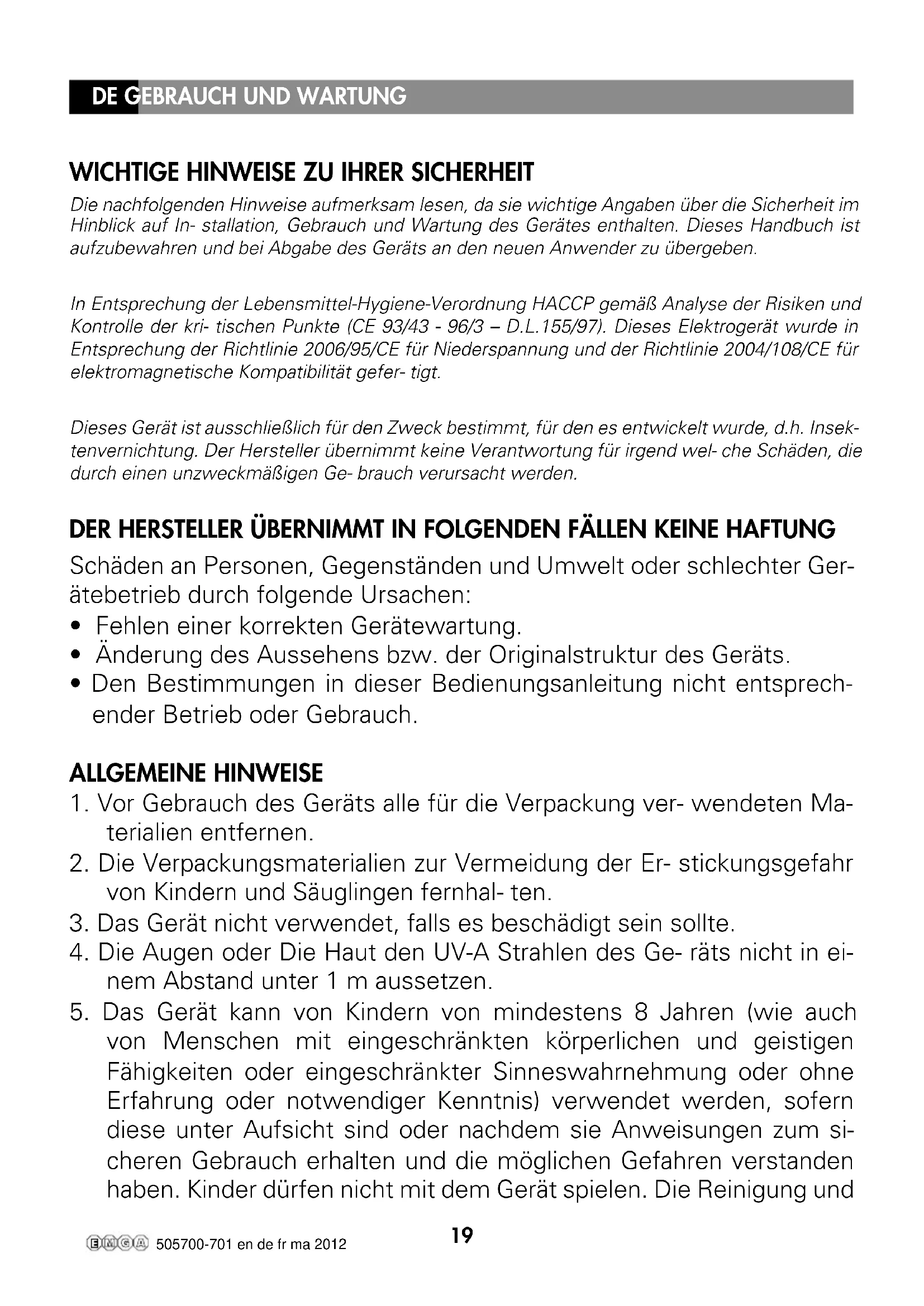 Die nachfolgenden Hinweise aufmerksam lesen, da sie wichtige Angaben über die Sicherheit im Hinblick auf In- stallation, Gebrauch und Wartung des Gerätes enthalten. Dieses Handbuch ist aufzubewahren und bei Abgabe des Geräts an den neuen Anwender zu übergeben. In Entsprechung der Lebensmittel-Hygiene-Verordnung HACCP gemäß Analyse der Risiken und Kontrolle der kri- tischen Punkte (CE 93/43 - 96/3 – D.L.155/97). Dieses Elektrogerät wurde in Entsprechung der Richtlinie 2006/95/CE für Niederspannung und der Richtlinie 2004/108/CE für elektromagnetische Kompatibilität gefer- tigt. Dieses Gerät ist ausschließlich für den Zweck bestimmt, für den es entwickelt wurde, d.h. Insek- tenvernichtung. Der Hersteller übernimmt keine Verantwortung für irgend wel- che Schäden, die durch einen unzweckmäßigen Ge- brauch verursacht werden. DER HERSTELLER ÜBERNIMMT IN FOLGENDEN FÄLLEN KEINE HAFTUNG Schäden an Personen, Gegenständen und Umwelt oder schlechter Ger- ätebetrieb durch folgende Ursachen: