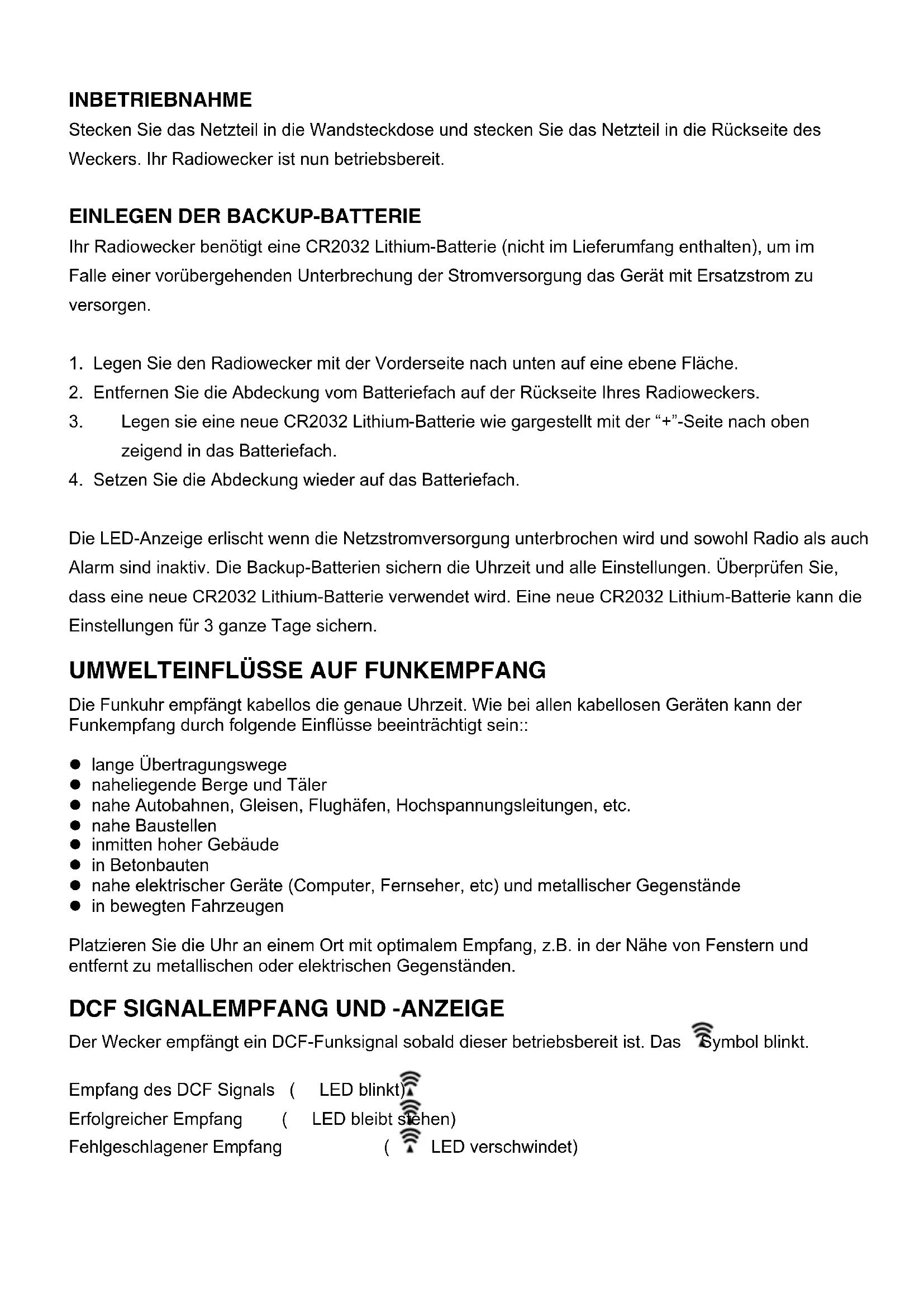 Die LED-Anzeige erlischt wenn die Netzstromversorgung unterbrochen wird und sowohl Radio als auch Alarm sind inaktiv. Die Backup-Batterien sichern die Uhrzeit und alle Einstellungen. Überprüfen Sie, dass eine neue CR2032 Lithium-Batterie verwendet wird. Eine neue CR2032 Lithium-Batterie kann die Einstellungen für 3 ganze Tage sichern.