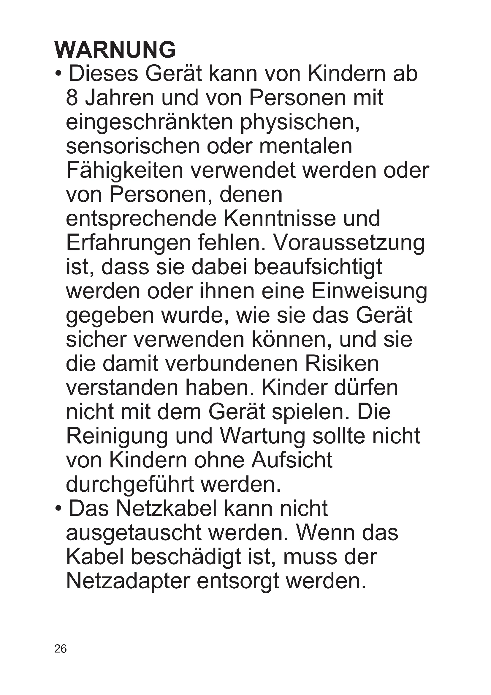 - Dieses Gerät kann von Kindern ab 8 Jahren und von Personen mit eingeschränkten physischen, sensorischen oder mentalen Fähigkeiten verwendet werden oder von Personen, denen entsprechende Kenntnisse und Erfahrungen fehlen. Voraussetzung ist, dass sie dabei beaufsichtigt werden oder ihnen eine Einweisung gegeben wurde, wie sie das Gerät sicher verwenden können, und sie diedamitverbundenenRisiken verstanden haben. Kinder dürfen nicht mit dem Gerät spielen. Die ReinigungundWartungsolltenicht von Kindern ohne Aufsicht durchgeführt werden.