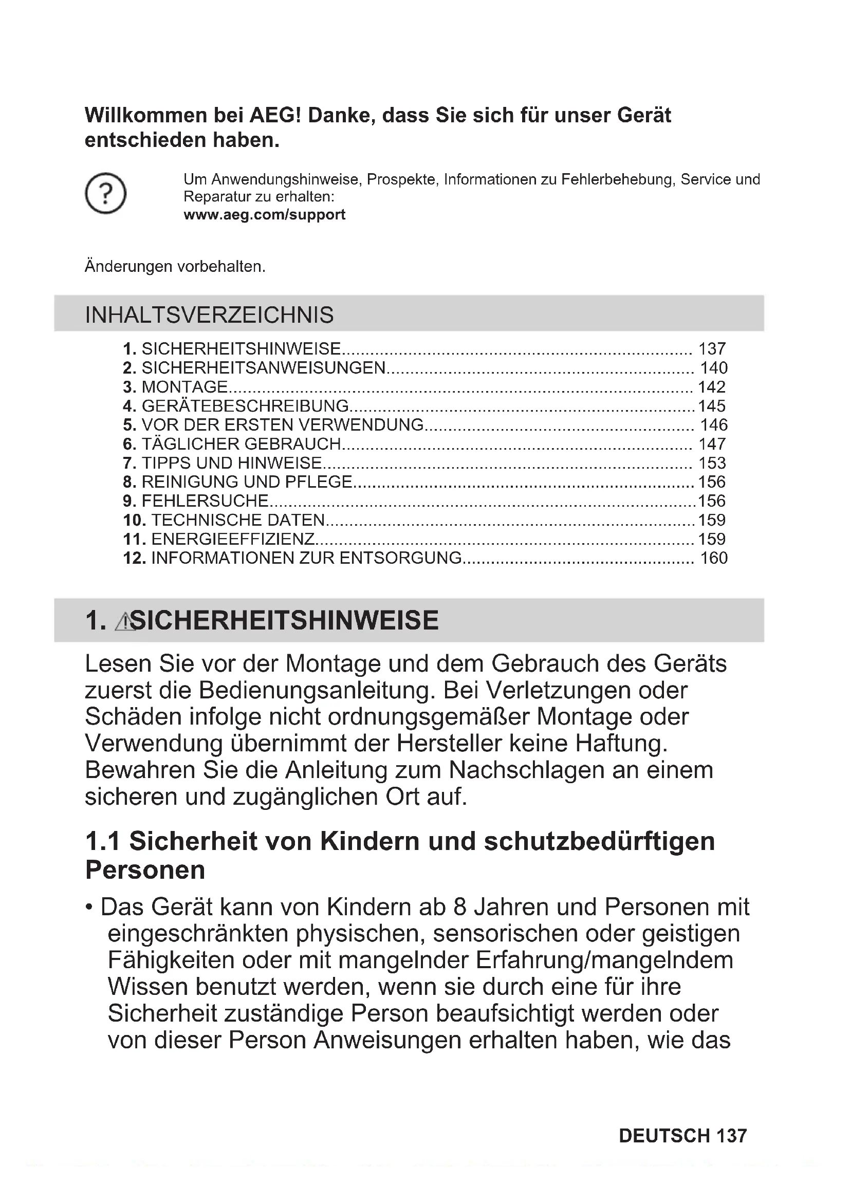 - Das Gerät kann von Kindern ab 8 Jahren und Personen mit eingeschränkten physischen, sensorischen oder geistigen Fähigkeiten oder mit mangelnder Erfahrung/mangelndem Wissen benutzt werden, wenn sie durch eine für ihre Sicherheit zuständige Person beaufsichtigt werden oder von dieser Person Anweisungen erhalten haben, wie das DEUTSCH 137Gerät sicher zu bedienen ist und welche Gefahren bei nicht ordnungsgemäßer Bedienung bestehen. Kinder unter 8 Jahren und Personen mit schweren Behinderungen oder Mehrfachbehinderung sollten vom Gerät ferngehalten werden, wenn sie nicht ständig beaufsichtigt werden.