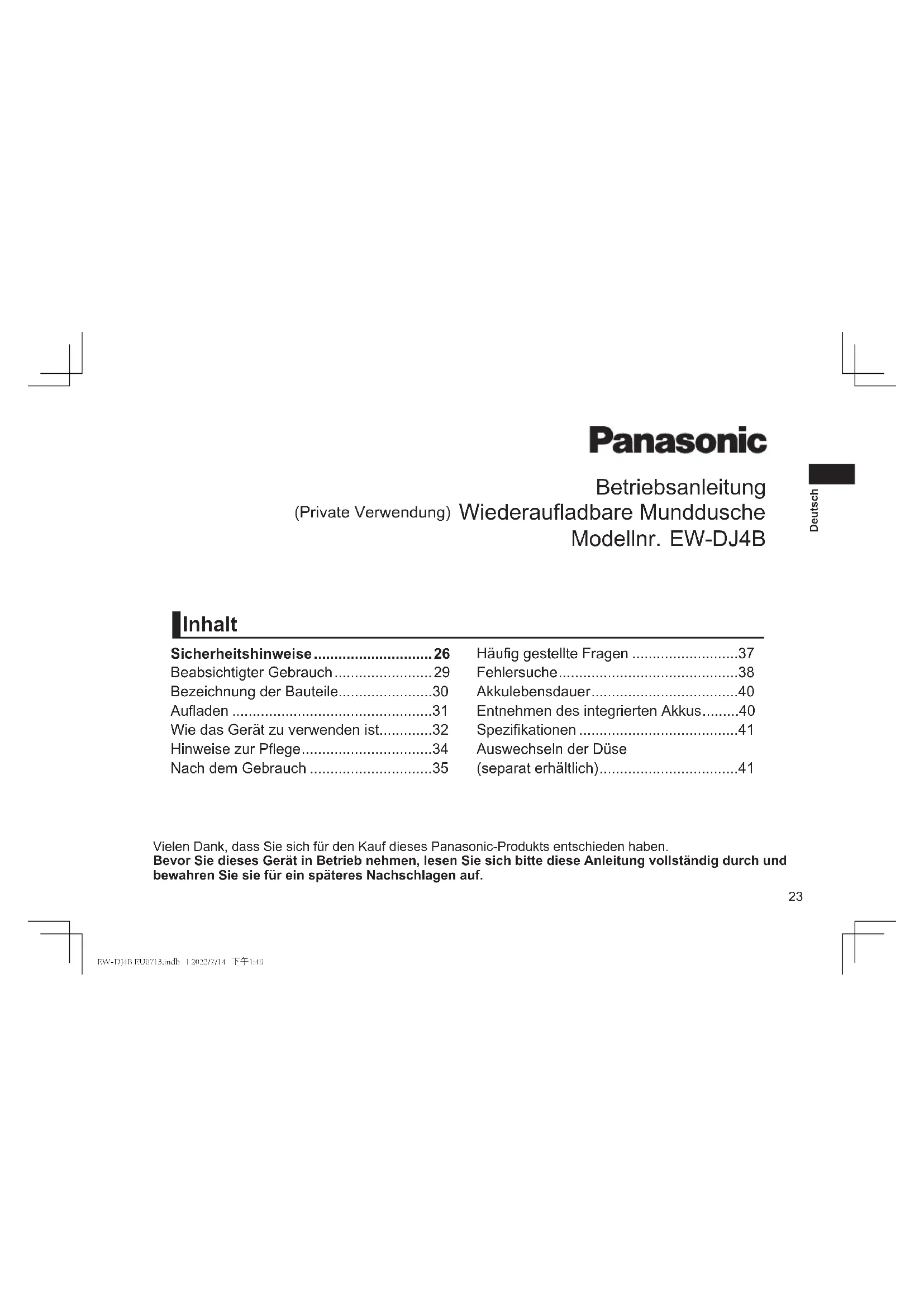 - EW-DJ4B EU0713.indb 22 2022/7/14 下午1:40Deutsch Vielen Dank, dass Sie sich für den Kauf dieses Panasonic-Produkts entschieden haben.Bevor Sie dieses Gerät in Betrieb nehmen, lesen Sie sich bitte diese Anleitung vollständig durch und bewahren Sie sie für ein späteres Nachschlagen auf. Inhalt Betriebsanleitung (Private Verwendung) Wiederaufladbare Munddusche Modellnr. EW-DJ4B Sicherheitshinweise p. 26