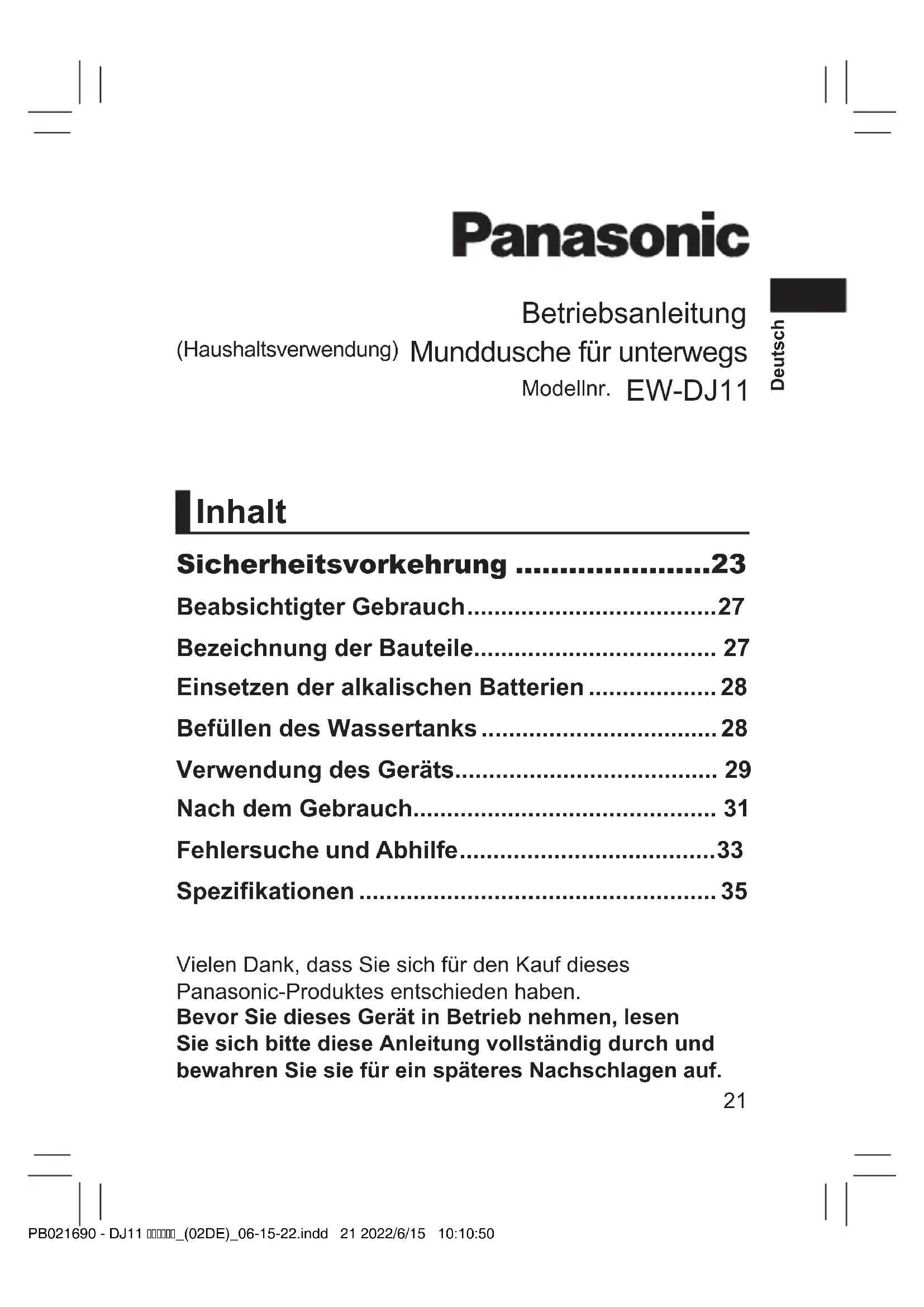 - Nicht wiederauadbare Batterien dürfen nicht aufgeladen werden. - Wird dies nicht befolgt, kann es durch Überhitzung, Explosion oder ein Leck der Batterien zu Verletzungen oder Kontamination der Umgebung kommen. PB021690 - DJ11 _(02DE)_06-15-22.indd 26 2022/6/15 10:10:5027 Deutsch Beabsichtigter Gebrauch