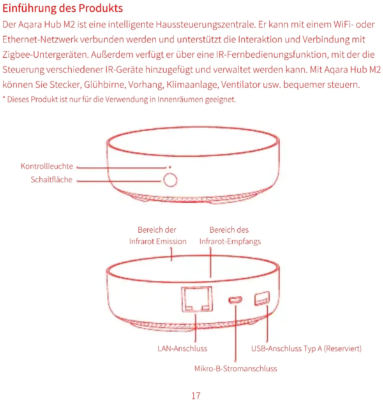 產品型號:HM2-G01 產品尺寸:φ100.5×30.75mm(φ3.95×1.21 in.) 輸入電壓:5V 1A 或 5V 2A 無線連接:Wi-Fi IEEE 802.11 b/g/n 2.4GHz,Zigbee3.0 IEEE 802.15.4,BLE 5.0 工作溫度:-5℃~+50℃(23℉~122℉) 工作濕度:0~95% RH,無冷凝 支持系統:Android 6.0或iOS 12.0及以上版本* Dieses Produkt ist nur für die Verwendung in Innenräumen geeignet. Einführung des Produkts Der Aqara Hub M2 ist eine intelligente Haussteuerungszentrale. Er kann mit einem WiFi- oder Ethernet-Netzwerk verbunden werden und unterstützt die Interaktion und Verbindung mit Zigbee-Untergeräten. Außerdem verfügt er über eine IR-Fernbedienungsfunktion, mit der die Steuerung verschiedener IR-Geräte hinzugefügt und verwaltet werden kann. Mit Aqara Hub M2 können Sie Stecker, Glühbirne, Vorhang, Klimaanlage, Ventilator usw. bequemer steuern. Kontrollleuchte Schaltfläche LAN-Anschluss Mikro-B-Stromanschluss USB-Anschluss Typ A (Reserviert) Bereich der Infrarot Emission Bereich des Infrarot-Empfangs 17Suchen Sie nach „Aqara Home“ im App Store oder scannen Sie den QR-Code. Laden Sie die Aqara Home App herunter und installieren Sie sie. Schnelle Einrichtung