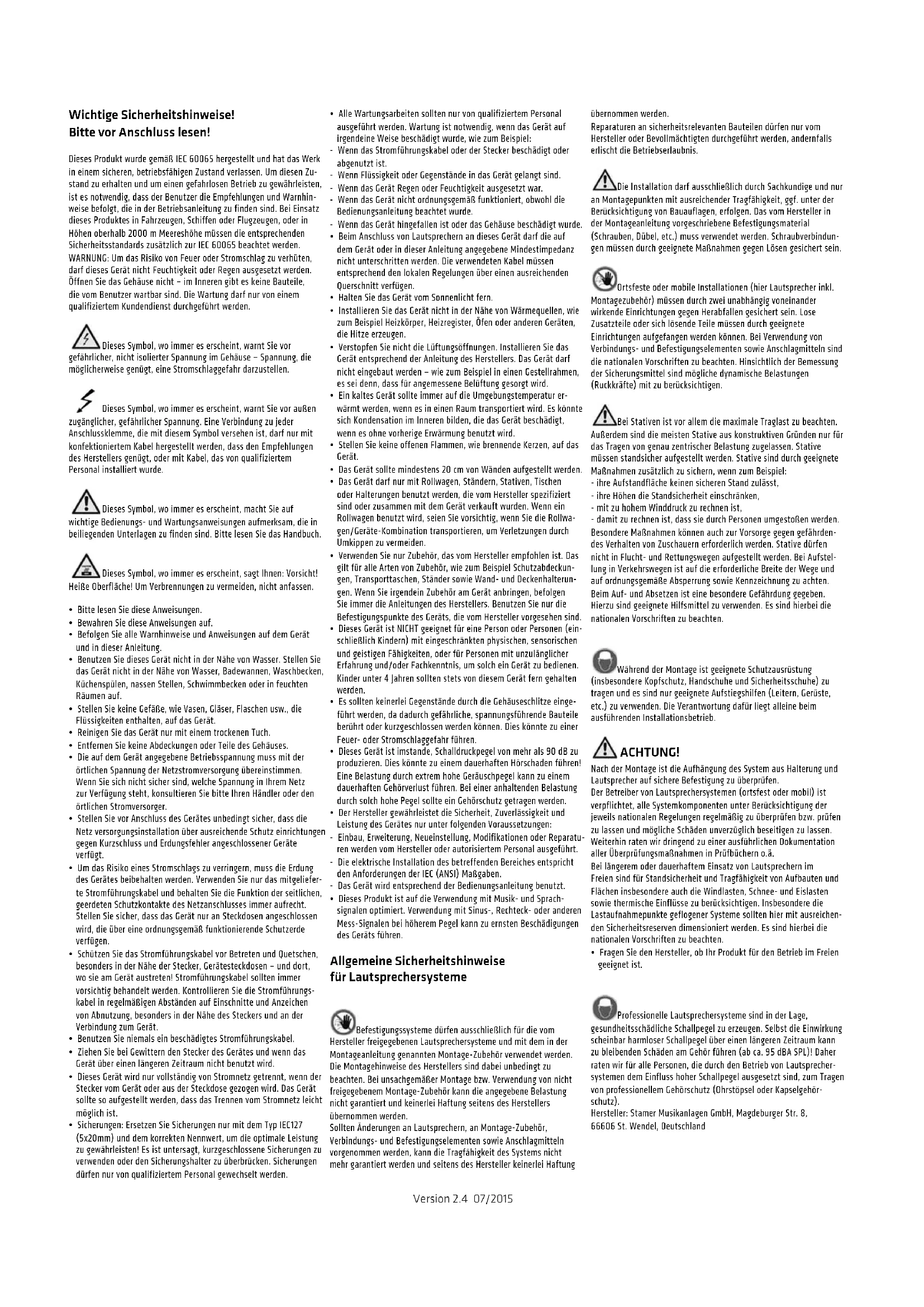 - Dieses Produkt ist auf die Verwendung mit Musik- und Sprach- signalen optimiert. Verwendung mit Sinus-, Rechteck- oder anderen Mess-Signalen bei höherem Pegel kann zu ernsten Beschädigungen des Geräts führen. Allgemeine Sicherheitshinweise für Lautsprechersysteme Befestigungssysteme dürfen ausschließlich für die vom Hersteller freigegebenen Lautsprechersysteme und mit dem in der Montageanleitung genannten Montage-Zubehör verwendet werden. Die Montagehinweise des Herstellers sind dabei unbedingt zu beachten. Bei unsachgemäßer Montage bzw. Verwendung von nicht freigegebenem Montage-Zubehör kann die angegebene Belastung nicht garantiert und keinerlei Haftung seitens des Herstellers übernommen werden. Sollten Änderungen an Lautsprechern, an Montage-Zubehör, Verbindungs- und Befestigungselementen sowie Anschlagmitteln vorgenommen werden, kann die Tragfähigkeit des Systems nicht mehr garantiert werden und seitens des Hersteller keinerlei Haftung übernommen werden. Reparaturen an sicherheitsrelevanten Bauteilen dürfen nur vom Hersteller oder Bevollmächtigten durchgeführt werden, andernfalls erlischt die Betriebserlaubnis. Die Installation darf ausschließlich durch Sachkundige und nur an Montagepunkten mit ausreichender Tragfähigkeit, ggf. unter der Berücksichtigung von Bauauflagen, erfolgen. Das vom Hersteller in der Montageanleitung vorgeschriebene Befestigungsmaterial (Schrauben, Dübel, etc.) muss verwendet werden. Schraubverbindun- gen müssen durch geeignete Maßnahmen gegen Lösen gesichert sein. Ortsfeste oder mobile Installationen (hier Lautsprecher inkl. Montagezubehör) müssen durch zwei unabhängig voneinander wirkende Einrichtungen gegen Herabfallen gesichert sein. Lose Zusatzteile oder sich lösende Teile müssen durch geeignete Einrichtungen aufgefangen werden können. Bei Verwendung von Verbindungs- und Befestigungselementen sowie Anschlagmitteln sind die nationalen Vorschriften zu beachten. Hinsichtlich der Bemessung der Sicherungsmittel sind mögliche dynamische Belastungen (Ruckkräfte) mit zu berücksichtigen. Bei Stativen ist vor allem die maximale Traglast zu beachten. Außerdem sind die meisten Stative aus konstruktiven Gründen nur für das Tragen von genau zentrischer Belastung zugelassen. Stative müssen standsicher aufgestellt werden. Stative sind durch geeignete Maßnahmen zusätzlich zu sichern, wenn zum Beispiel: - ihre Aufstandfläche keinen sicheren Stand zulässt, - ihre Höhen die Standsicherheit einschränken, - mit zu hohem Winddruck zu rechnen ist, - damit zu rechnen ist, dass sie durch Personen umgestoßen werden. Besondere Maßnahmen können auch zur Vorsorge gegen gefährden- des Verhalten von Zuschauern erforderlich werden. Stative dürfen nicht in Flucht- und Rettungswegen aufgestellt werden. Bei Aufstel- lung in Verkehrswegen ist auf die erforderliche Breite der Wege und auf ordnungsgemäße Absperrung sowie Kennzeichnung zu achten. Beim Auf- und Absetzen ist eine besondere Gefährdung gegeben. Hierzu sind geeignete Hilfsmittel zu verwenden. Es sind hierbei die nationalen Vorschriften zu beachten. Während der Montage ist geeignete Schutzausrüstung (insbesondere Kopfschutz, Handschuhe und Sicherheitsschuhe) zu tragen und es sind nur geeignete Aufstiegshilfen (Leitern, Gerüste, etc.) zu verwenden. Die Verantwortung dafür liegt alleine beim ausführenden Installationsbetrieb. ACHTUNG! Nach der Montage ist die Aufhängung des System aus Halterung und Lautsprecher auf sichere Befestigung zu überprüfen. Der Betreiber von Lautsprechersystemen (ortsfest oder mobil) ist verpflichtet, alle Systemkomponenten unter Berücksichtigung der jeweils nationalen Regelungen regelmäßig zu überprüfen bzw. prüfen zu lassen und mögliche Schäden unverzüglich beseitigen zu lassen. Weiterhin raten wir dringend zu einer ausführlichen Dokumentation aller Überprüfungsmaßnahmen in Prüfbüchern o.ä. Bei längerem oder dauerhaftem Einsatz von Lautsprechern im Freien sind für Standsicherheit und Tragfähigkeit von Aufbauten und Flächen insbesondere auch die Windlasten, Schnee- und Eislasten sowie thermische Einflüsse zu berücksichtigen. Insbesondere die Lastaufnahmepunkte geflogener Systeme sollten hier mit ausreichen- den Sicherheitsreserven dimensioniert werden. Es sind hierbei die nationalen Vorschriften zu beachten.