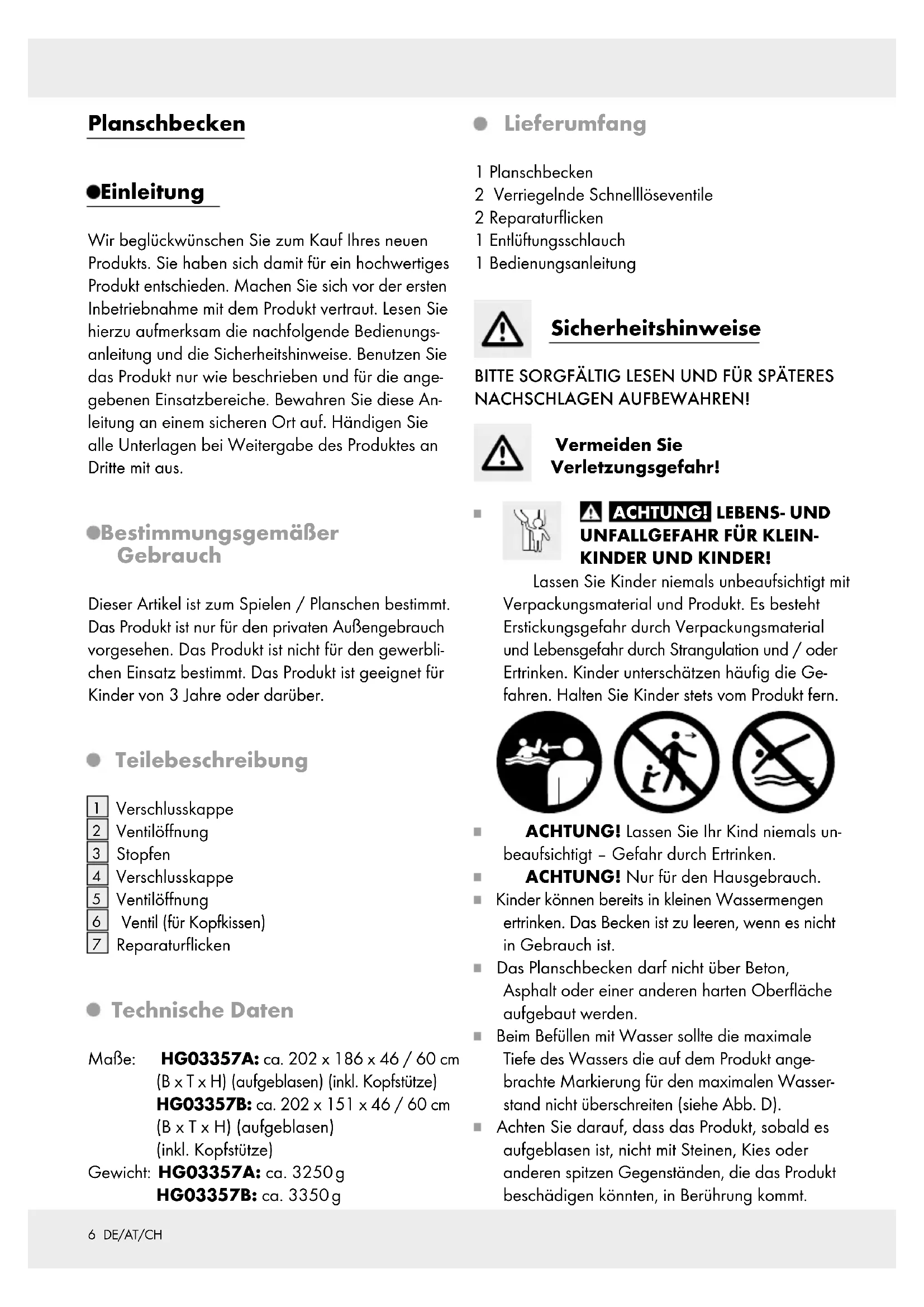 Reparaturflicken Technische Daten Maße: HG03357A: ca. 202 x 186 x 46 / 60 cm (B x T x H) (aufgeblasen) (inkl. Kopfstütze) HG03357B: ca. 202 x 151 x 46 / 60 cm (B x T x H) (aufgeblasen) (inkl. Kopfstütze) Gewicht: HG03357A: ca. 3250 g HG03357B: ca. 3350 g Lieferumfang 1 Planschbecken 2 Verriegelnde Schnelllöseventile 2 Reparaturflicken 1 Entlüftungsschlauch 1 Bedienungsanleitung Sicherheitshinweise BITTE SORGFÄLTIG LESEN UND FÜR SPÄTERES NACHSCHLAGEN AUFBEWAHREN! Vermeiden Sie Verletzungsgefahr! ACHTUNG! LEBENS- UND