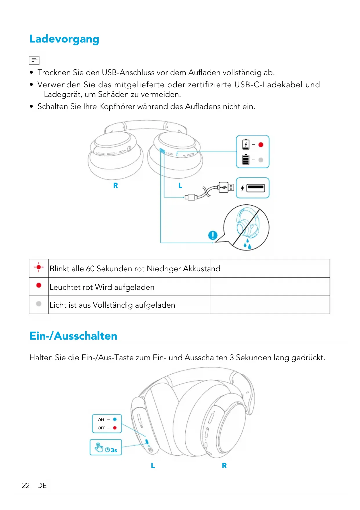 - Schalten Sie Ihre Kopfhörer während des Auadens nicht ein. R L Blinkt alle 60 Sekunden rot Niedriger Akkustand Leuchtet rot Wird aufgeladen Licht ist aus Vollständig aufgeladen Ein-/Ausschalten Halten Sie die Ein-/Aus-Taste zum Ein- und Ausschalten 3 Sekunden lang gedrückt.