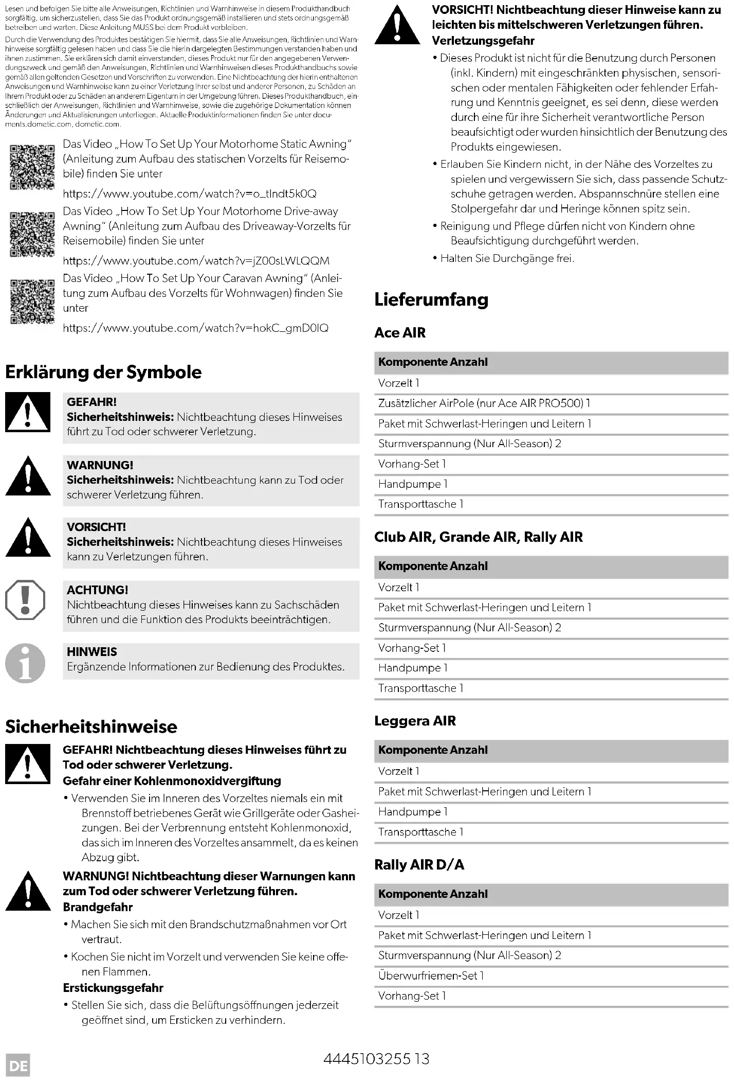 - Halten Sie Durchgänge frei. Lieferumfang Ace AIR Club AIR, Grande AIR, Rally AIR Leggera AIR Rally AIR D/A Das Video „How To Set Up Your Motorhome Static Awning“ (Anleitung zum Aufbau des statischen Vorzelts für Reisemo- bile) finden Sie unter https://www.youtube.com/watch?v=o_tIndt5k0Q Das Video „How To Set Up Your Motorhome Drive-away Awning“ (Anleitung zum Aufbau des Driveaway-Vorzelts für Reisemobile) finden Sie unter https://www.youtube.com/watch?v=jZ00sLWLQQM Das Video „How To Set Up Your Caravan Awning“ (Anlei- tung zum Aufbau des Vorzelts für Wohnwagen) finden Sie unter https://www.youtube.com/watch?v=hokC_gmD0lQ GEFAHR! Sicherheitshinweis: Nichtbeachtung dieses Hinweises führt zu Tod oder schwerer Verletzung. WARNUNG! Sicherheitshinweis: Nichtbeachtung kann zu Tod oder schwerer Verletzung führen. VORSICHT! Sicherheitshinweis: Nichtbeachtung dieses Hinweises kann zu Verletzungen führen. ACHTUNG! Nichtbeachtung dieses Hinweises kann zu Sachschäden führen und die Funktion des Produkts beeinträchtigen. HINWEIS Ergänzende Informationen zur Bedienung des Produktes. Komponente Anzahl Vorzelt 1 Zusätzlicher AirPole (nur Ace AIR PRO500) 1 Paket mit Schwerlast-Heringen und Leitern 1 Sturmverspannung (Nur All-Season) 2 Vorhang-Set 1 Handpumpe 1 Transporttasche 1 Komponente Anzahl Vorzelt 1 Paket mit Schwerlast-Heringen und Leitern 1 Sturmverspannung (Nur All-Season) 2 Vorhang-Set 1 Handpumpe 1 Transporttasche 1 Komponente Anzahl Vorzelt 1 Paket mit Schwerlast-Heringen und Leitern 1 Handpumpe 1 Transporttasche 1 Komponente Anzahl Vorzelt 1 Paket mit Schwerlast-Heringen und Leitern 1 Sturmverspannung (Nur All-Season) 2 Überwurfriemen-Set 1 Vorhang-Set 1DE