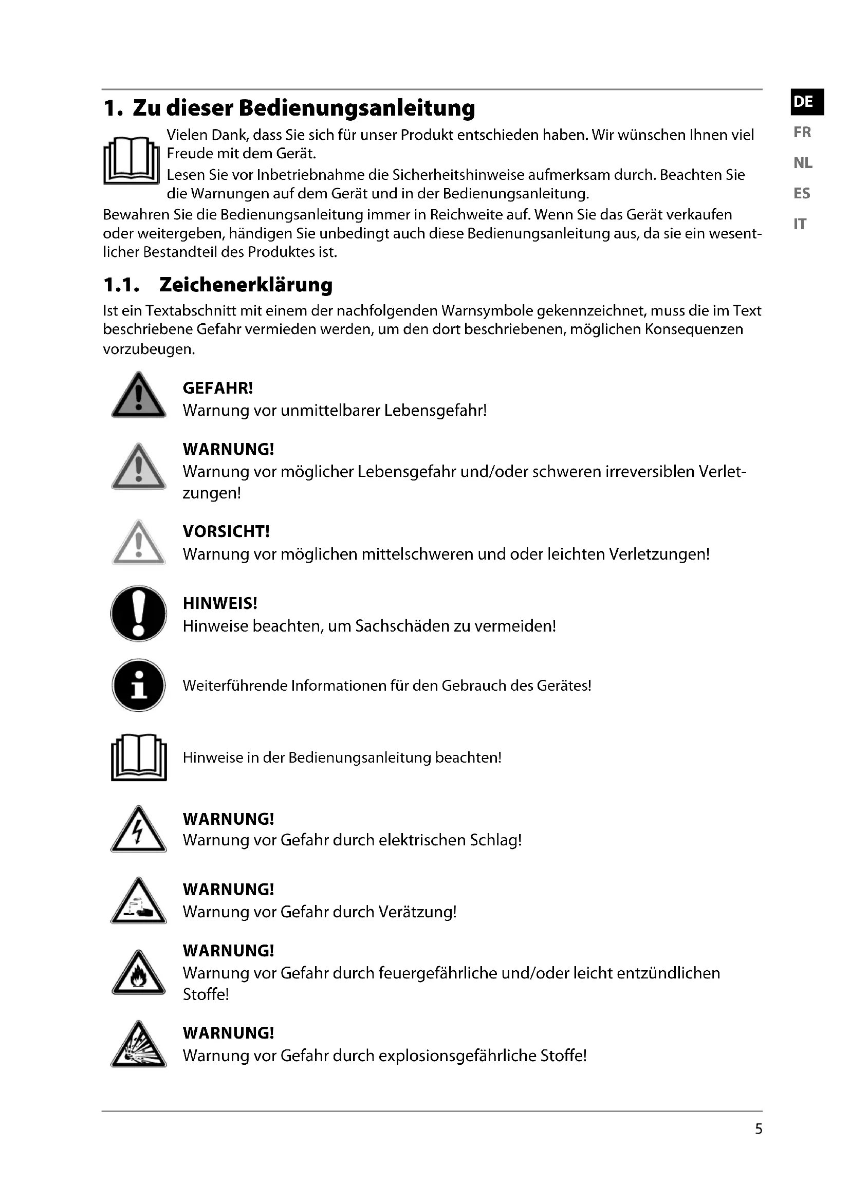 Vielen Dank, dass Sie sich für unser Produkt entschieden haben. Wir wünschen Ihnen viel Freude mit dem Gerät. Lesen Sie vor Inbetriebnahme die Sicherheitshinweise aufmerksam durch. Beachten Sie die Warnungen auf dem Gerät und in der Bedienungsanleitung. Bewahren Sie die Bedienungsanleitung immer in Reichweite auf. Wenn Sie das Gerät verkaufen oder weitergeben, händigen Sie unbedingt auch diese Bedienungsanleitung aus, da sie ein wesent- licher Bestandteil des Produktes ist. 1.1. Zeichenerklärung Ist ein Textabschnitt mit einem der nachfolgenden Warnsymbole gekennzeichnet, muss die im Text beschriebene Gefahr vermieden werden, um den dort beschriebenen, möglichen Konsequenzen vorzubeugen. GEFAHR! Warnung vor unmittelbarer Lebensgefahr! WARNUNG! Warnung vor möglicher Lebensgefahr und/oder schweren irreversiblen Verlet- zungen! VORSICHT! Warnung vor möglichen mittelschweren und oder leichten Verletzungen! HINWEIS! Hinweise beachten, um Sachschäden zu vermeiden! Weiterführende Informationen für den Gebrauch des Gerätes! Hinweise in der Bedienungsanleitung beachten! WARNUNG! Warnung vor Gefahr durch elektrischen Schlag! WARNUNG! Warnung vor Gefahr durch Verätzung! WARNUNG! Warnung vor Gefahr durch feuergefährliche und/oder leicht entzündlichen Stoffe! WARNUNG! Warnung vor Gefahr durch explosionsgefährliche Stoffe! 19731 ML Direct Sales ML Content 5006 8711 Final_rev1.indb 519731 ML Direct Sales ML Content 5006 8711 Final_rev1.indb 5 08.06.2022 11:03:0508.06.2022 11:03:056