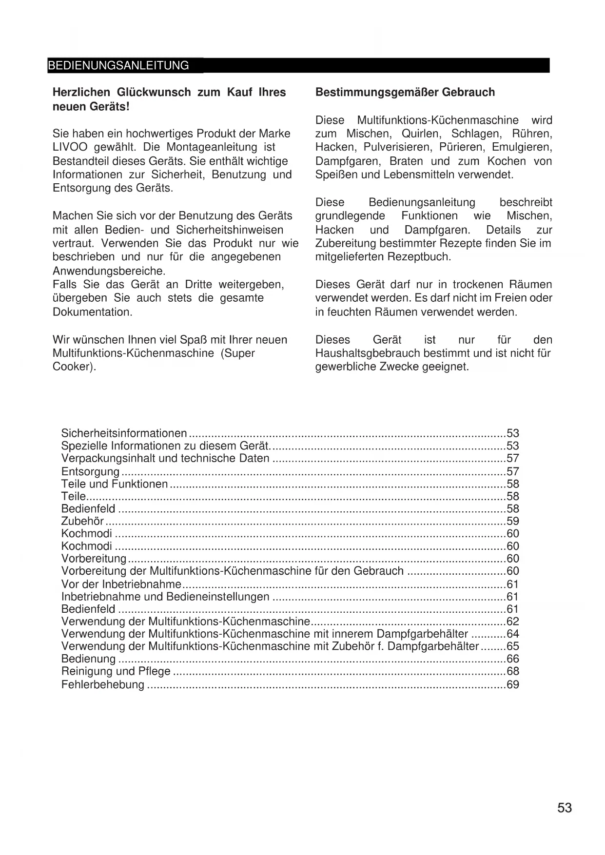 Importado por: DELTA BP61071 67452 Mundolsheim France 52BEDIENUNGSANLEITUNG Herzlichen Glückwunsch zum Kauf Ihres neuen Geräts! Sie haben ein hochwertiges Produkt der Marke LIVOO gewählt. Die Montageanleitung ist Bestandteil dieses Geräts. Sie enthält wichtige Informationen zur Sicherheit, Benutzung und Entsorgung des Geräts. Machen Sie sich vor der Benutzung des Geräts mit allen Bedien- und Sicherheitshinweisen vertraut. Verwenden Sie das Produkt nur wie beschrieben und nur für die angegebenen Anwendungsbereiche. Falls Sie das Gerät an Dritte weitergeben, übergeben Sie auch stets die gesamte Dokumentation. Wir wünschen Ihnen viel Spaß mit Ihrer neuen Multifunktions-Küchenmaschine (Super Cooker). Bestimmungsgemäßer Gebrauch Diese Multifunktions-Küchenmaschine wird zum Mischen, Quirlen, Schlagen, Rühren, Hacken, Pulverisieren, Pürieren, Emulgieren, Dampfgaren, Braten und zum Kochen von Speißen und Lebensmitteln verwendet. Diese Bedienungsanleitung beschreibt grundlegende Funktionen wie Mischen, Hacken und Dampfgaren. Details zur Zubereitung bestimmter Rezepte finden Sie im mitgelieferten Rezeptbuch. Dieses Gerät darf nur in trockenen Räumen verwendet werden. Es darf nicht im Freien oder in feuchten Räumen verwendet werden. Dieses Gerät ist nur für den Haushaltsgbebrauch bestimmt und ist nicht für gewerbliche Zwecke geeignet.