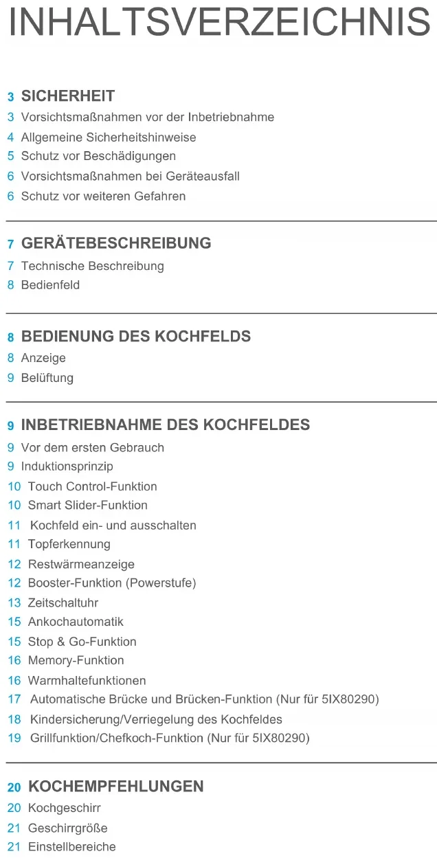 9 Vor dem ersten Gebrauch 9 Induktionsprinzip 10 Touch Control-Funktion 10 Smart Slider-Funktion 11 Kochfeld ein- und ausschalten 11 Topferkennung 12 Restwärmeanzeige 12 Booster-Funktion (Powerstufe) 13 Zeitschaltuhr 15 Ankochautomatik 15 Stop & Go-Funktion 16 Memory-Funktion 16 Warmhaltefunktionen 17 Automatische Brücke und Brücken-Funktion (Nur für 5IX80290) 18 Kindersicherung/Verriegelung des Kochfeldes 19 Grillfunktion/Chefkoch-Funktion (Nur für 5IX80290) 20 KOCHEMPFEHLUNGEN 20 Kochgeschirr 21 Geschirrgröße 21 Einstellbereiche22 INBETRIEBNAHME DER HAUBE (NICHT FÜR 5IZ34291) 22 Erste Schritte 22 Booster Funktion 22 Timer Funktion 23 Automatische Funktion