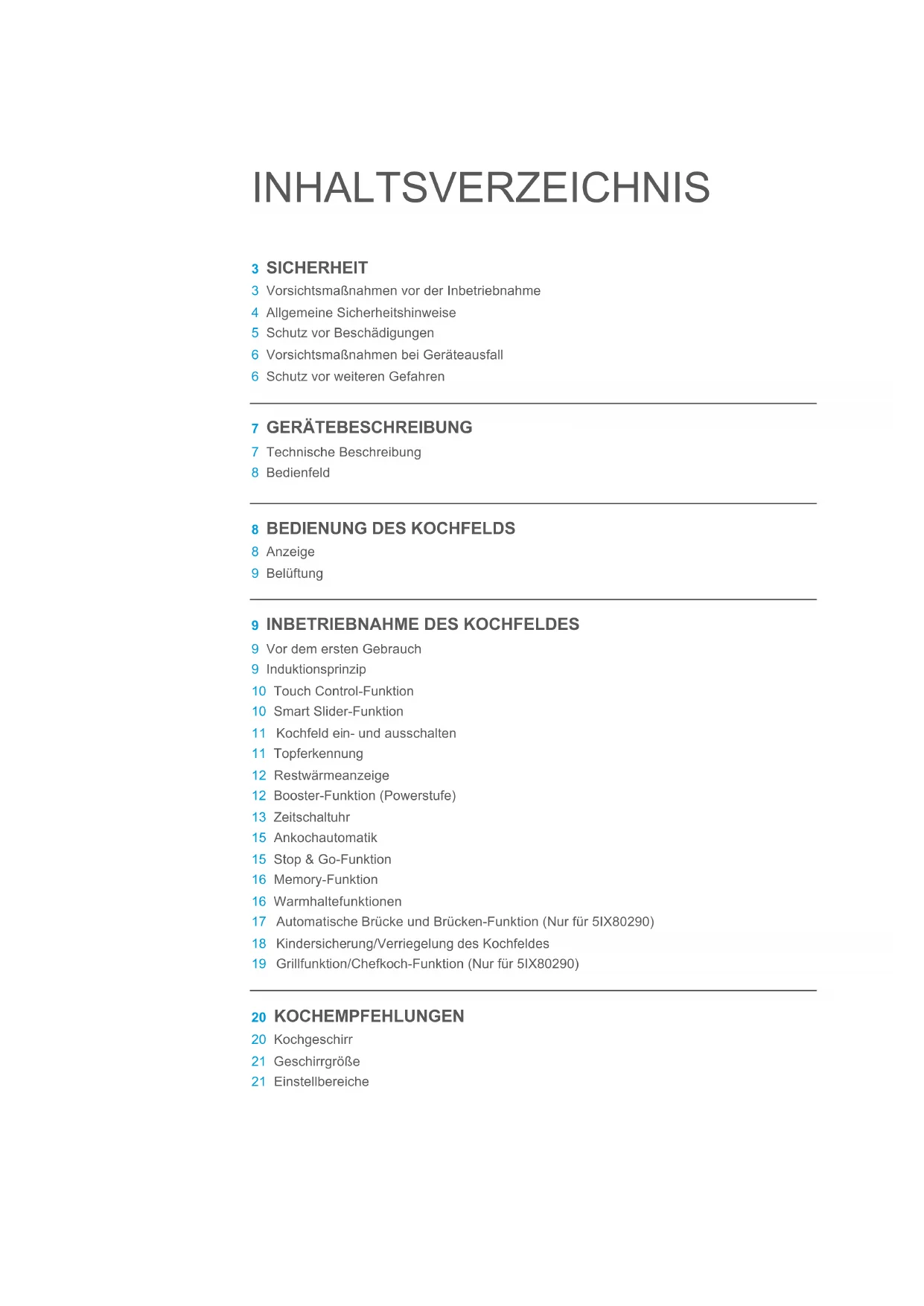 9 Vor dem ersten Gebrauch 9 Induktionsprinzip 10 Touch Control-Funktion 10 Smart Slider-Funktion 11 Kochfeld ein- und ausschalten 11 Topferkennung 12 Restwärmeanzeige 12 Booster-Funktion (Powerstufe) 13 Zeitschaltuhr 15 Ankochautomatik 15 Stop & Go-Funktion 16 Memory-Funktion 16 Warmhaltefunktionen 17 Automatische Brücke und Brücken-Funktion (Nur für 5IX80290) 18 Kindersicherung/Verriegelung des Kochfeldes 19 Grillfunktion/Chefkoch-Funktion (Nur für 5IX80290) 20 KOCHEMPFEHLUNGEN 20 Kochgeschirr 21 Geschirrgröße 21 Einstellbereiche22 INBETRIEBNAHME DER HAUBE (NICHT FÜR 5IZ34291) 22 Erste Schritte 22 Booster Funktion 22 Timer Funktion 23 Automatische Funktion