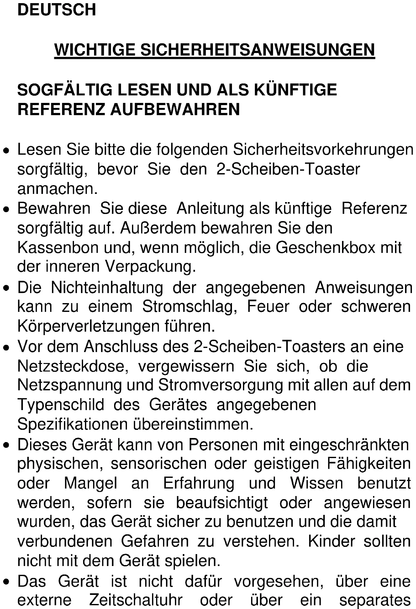 Lesen Sie bitte die folgenden Sicherheitsvorkehrungen sorgfältig, bevor Sie den 2-Scheiben-Toaster anmachen.