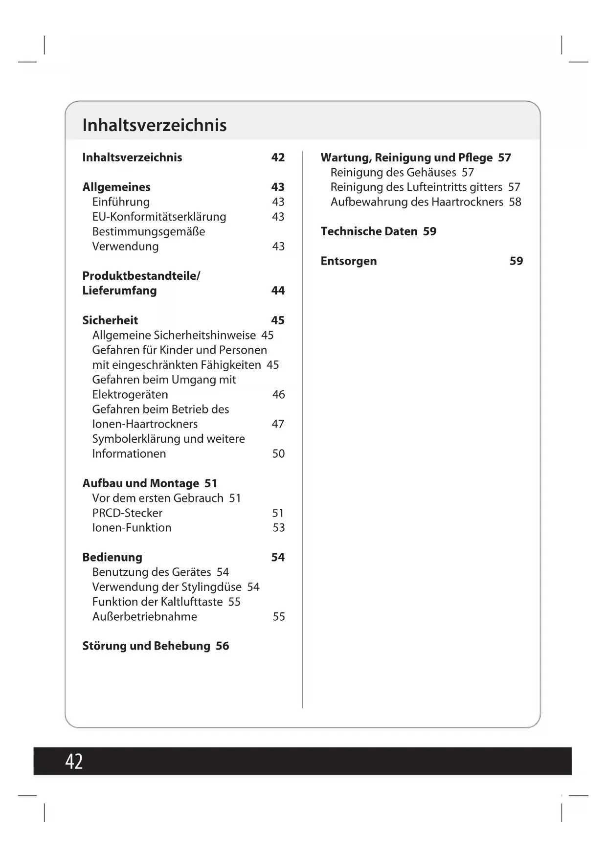 Inhaltsverzeichnis 42 Allgemeines 43 Einführung 43 EU-Konformitätserklärung 43 Bestimmungsgemäße Verwendung 43 Produktbestandteile/ Lieferumfang 44 Sicherheit 45 Allgemeine Sicherheitshinweise 45 Gefahren für Kinder und Personen mit eingeschränkten Fähigkeiten 45 Gefahren beim Umgang mit Elektrogeräten 46 Gefahren beim Betrieb des Ionen-Haartrockners 47 Symbolerklärung und weitere Informationen 50 Aufbau und Montage 51 Vor dem ersten Gebrauch 51 PRCD-Stecker 51 Ionen-Funktion 53 Bedienung 54 Benutzung des Gerätes 54 Verwendung der Stylingdüse 54 Funktion der Kaltlufttaste 55 Außerbetriebnahme 55 Störung und Behebung 56 Wartung, Reinigung und Pflege 57 Reinigung des Gehäuses 57 Reinigung des Lufteintritts gitters 57 Aufbewahrung des Haartrockners 58 Technische Daten 59 Entsorgen 59 Inhaltsverzeichnis43