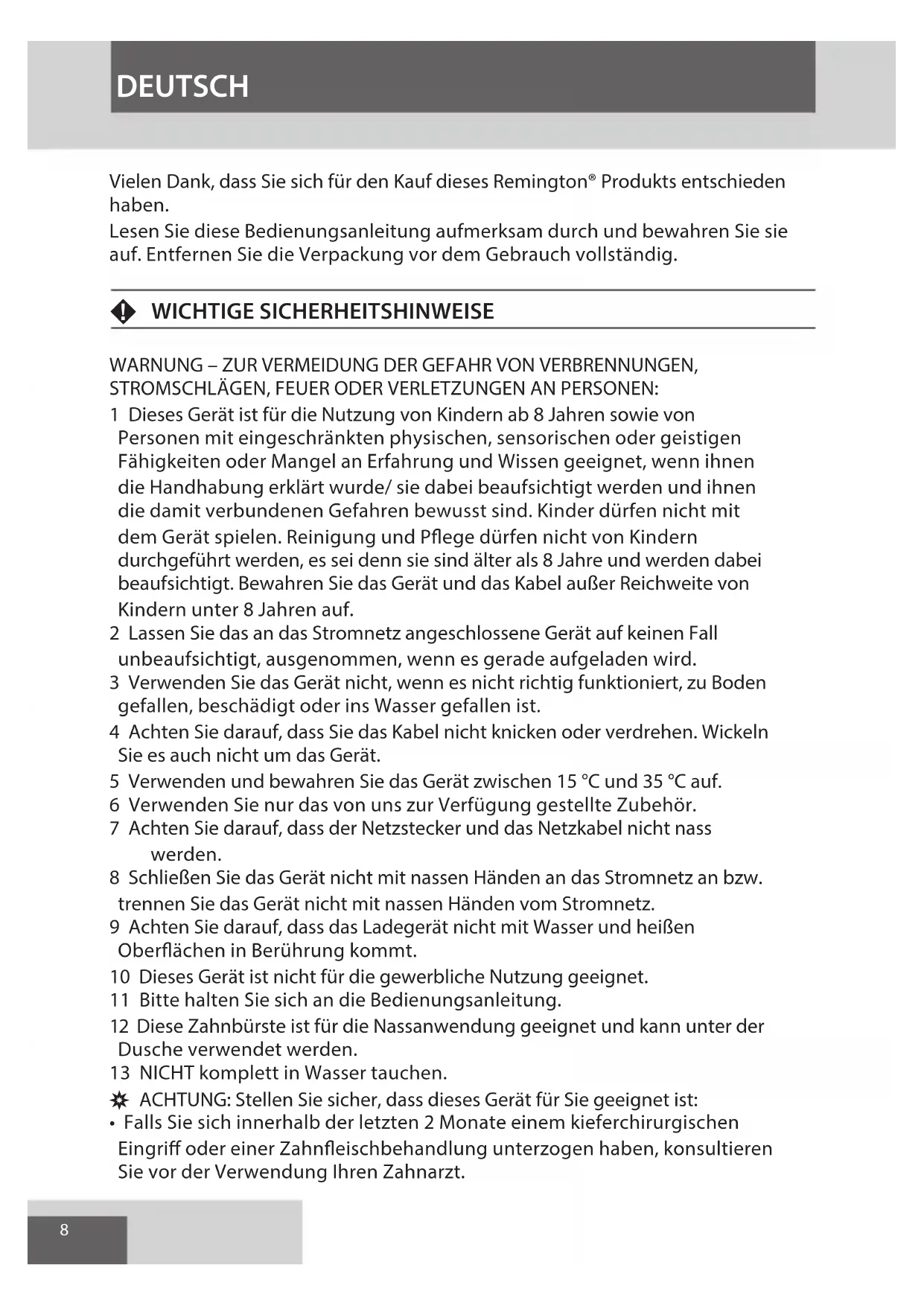 WARNUNG – ZUR VERMEIDUNG DER GEFAHR VON VERBRENNUNGEN, STROMSCHLÄGEN, FEUER ODER VERLETZUNGEN AN PERSONEN: 1 Dieses Gerät ist für die Nutzung von Kindern ab 8 Jahren sowie von Personen mit eingeschränkten physischen, sensorischen oder geistigen Fähigkeiten oder Mangel an Erfahrung und Wissen geeignet, wenn ihnen die Handhabung erklärt wurde/ sie dabei beaufsichtigt werden und ihnen die damit verbundenen Gefahren bewusst sind. Kinder dürfen nicht mit dem Gerät spielen. Reinigung und Pege dürfen nicht von Kindern durchgeführt werden, es sei denn sie sind älter als 8 Jahre und werden dabei beaufsichtigt. Bewahren Sie das Gerät und das Kabel außer Reichweite von Kindern unter 8 Jahren auf. 2 Lassen Sie das an das Stromnetz angeschlossene Gerät auf keinen Fall unbeaufsichtigt, ausgenommen, wenn es gerade aufgeladen wird. 3 Verwenden Sie das Gerät nicht, wenn es nicht richtig funktioniert, zu Boden gefallen, beschädigt oder ins Wasser gefallen ist. 4 Achten Sie darauf, dass Sie das Kabel nicht knicken oder verdrehen. Wickeln Sie es auch nicht um das Gerät. 5 Verwenden und bewahren Sie das Gerät zwischen 15 °C und 35 °C auf. 6 Verwenden Sie nur das von uns zur Verfügung gestellte Zubehör. 7 Achten Sie darauf, dass der Netzstecker und das Netzkabel nicht nass werden. 8 Schließen Sie das Gerät nicht mit nassen Händen an das Stromnetz an bzw. trennen Sie das Gerät nicht mit nassen Händen vom Stromnetz. 9 Achten Sie darauf, dass das Ladegerät nicht mit Wasser und heißen Oberächen in Berührung kommt. 10 Dieses Gerät ist nicht für die gewerbliche Nutzung geeignet. 11 Bitte halten Sie sich an die Bedienungsanleitung. 12 Diese Zahnbürste ist für die Nassanwendung geeignet und kann unter der Dusche verwendet werden. 13 NICHT komplett in Wasser tauchen. , ACHTUNG: Stellen Sie sicher, dass dieses Gerät für Sie geeignet ist: