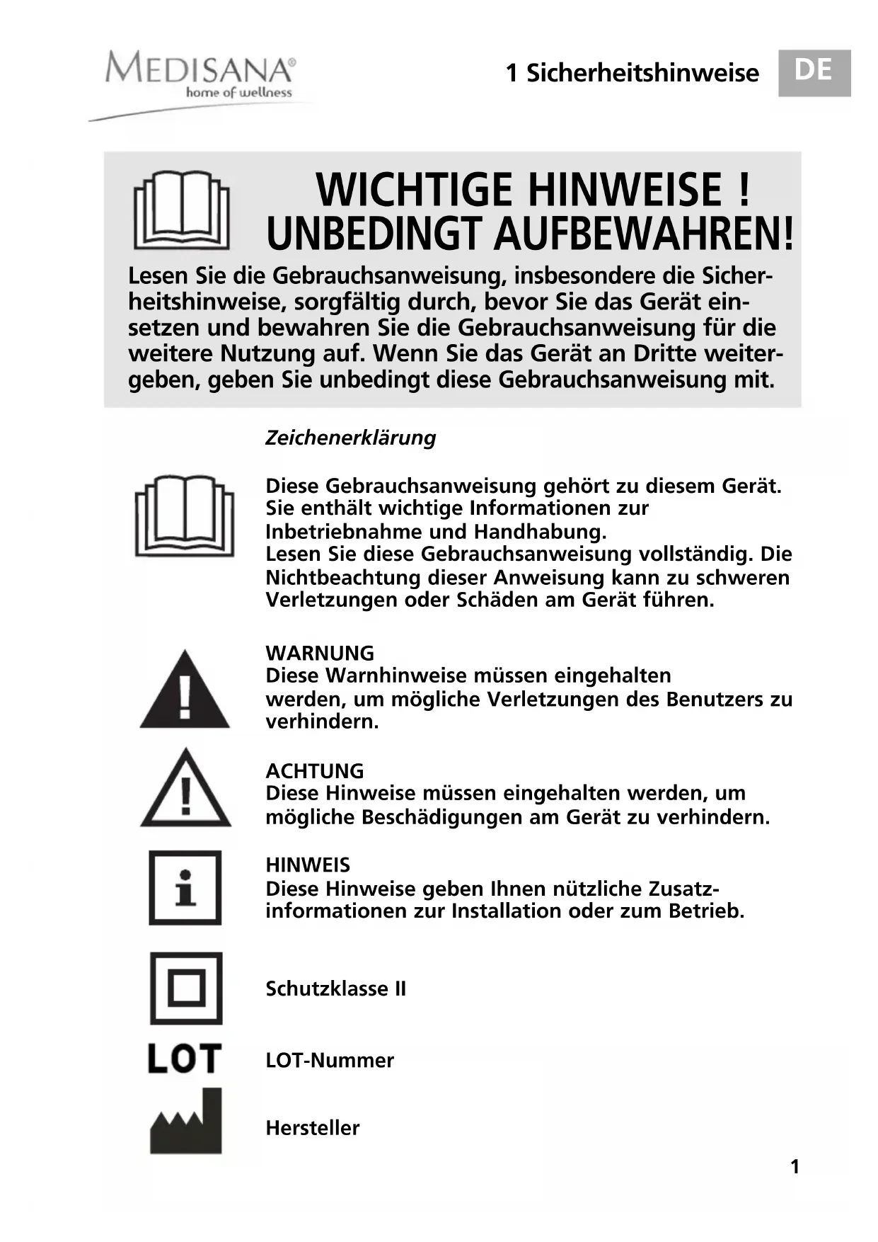 1 Sicherheitshinweise WICHTIGE HINWEISE ! UNBEDINGT AUFBEWAHREN! Zeichenerklärung Diese Gebrauchsanweisung gehört zu diesem Gerät. Sie enthält wichtige Informationen zur Inbetriebnahme und Handhabung. Lesen Sie diese Gebrauchsanweisung vollständig. Die Nichtbeachtung dieser Anweisung kann zu schweren Verletzungen oder Schäden am Gerät führen. WARNUNG Diese Warnhinweise müssen eingehalten werden, um mögliche Verletzungen des Benutzers zu verhindern. ACHTUNG Diese Hinweise müssen eingehalten werden, um mögliche Beschädigungen am Gerät zu verhindern. HINWEIS Diese Hinweise geben Ihnen nützliche Zusatz- informationen zur Installation oder zum Betrieb. Schutzklasse II LOT-Nummer Hersteller Lesen Sie die Gebrauchsanweisung, insbesondere die Sicher- heitshinweise, sorgfältig durch, bevor Sie das Gerät ein- setzen und bewahren Sie die Gebrauchsanweisung für die weitere Nutzung auf. Wenn Sie das Gerät an Dritte weiter- geben, geben Sie unbedingt diese Gebrauchsanweisung mit.2 1 Sicherheitshinweise