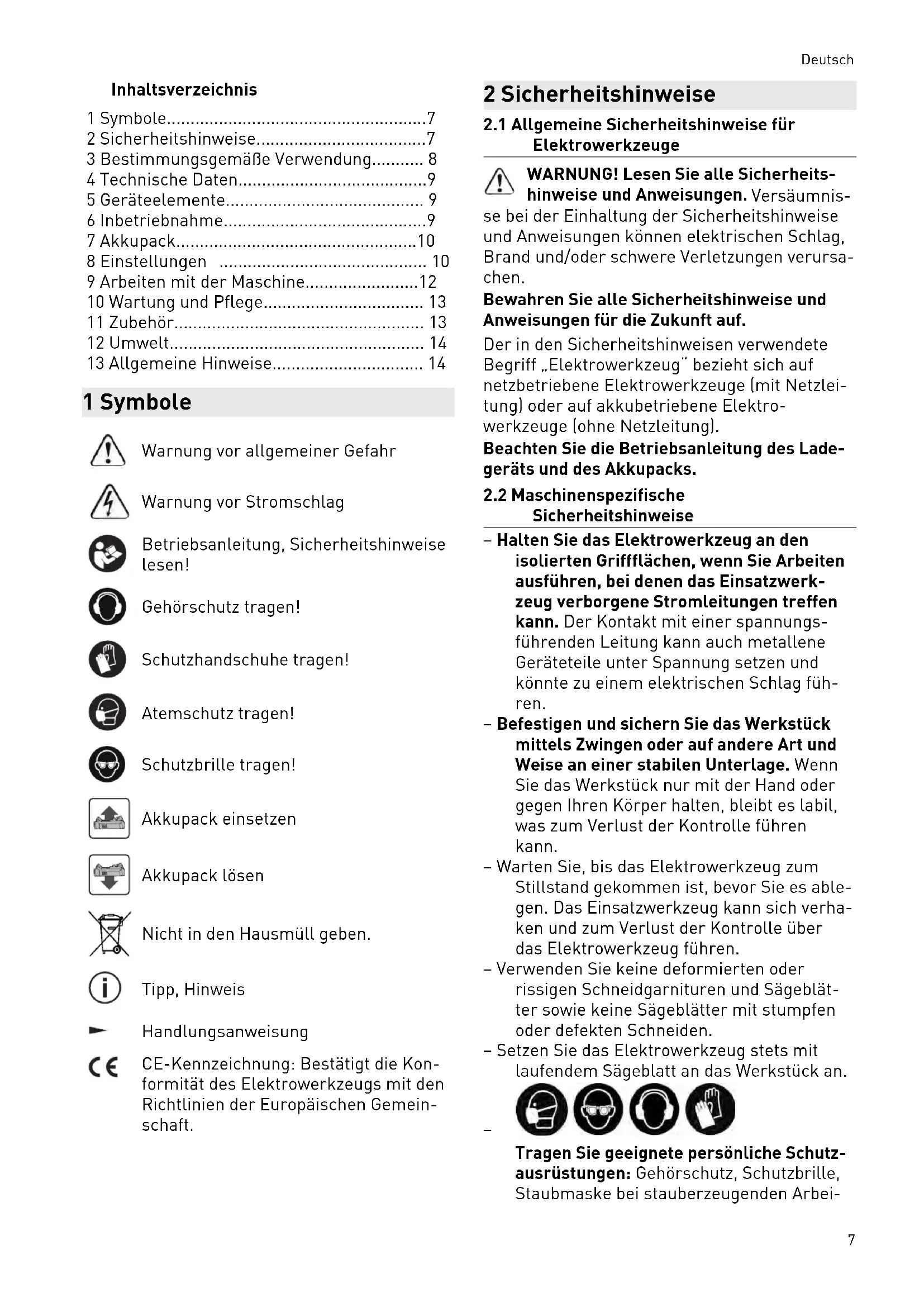 - 13 Allgemeine Hinweise 1 Symbole Warnung vor allgemeiner Gefahr Warnung vor Stromschlag Betriebsanleitung, Sicherheitshinweise lesen! Gehörschutz tragen! Schutzhandschuhe tragen! Atemschutz tragen! Schutzbrille tragen! Akkupack einsetzen Akkupack lösen Nicht in den Hausmüll geben. Tipp, Hinweis Handlungsanweisung CE-Kennzeichnung: Bestätigt die Kon formität des Elektrowerkzeugs mit den Richtlinien der Europäischen Gemein schaft. 2 Sicherheitshinweise p. 14