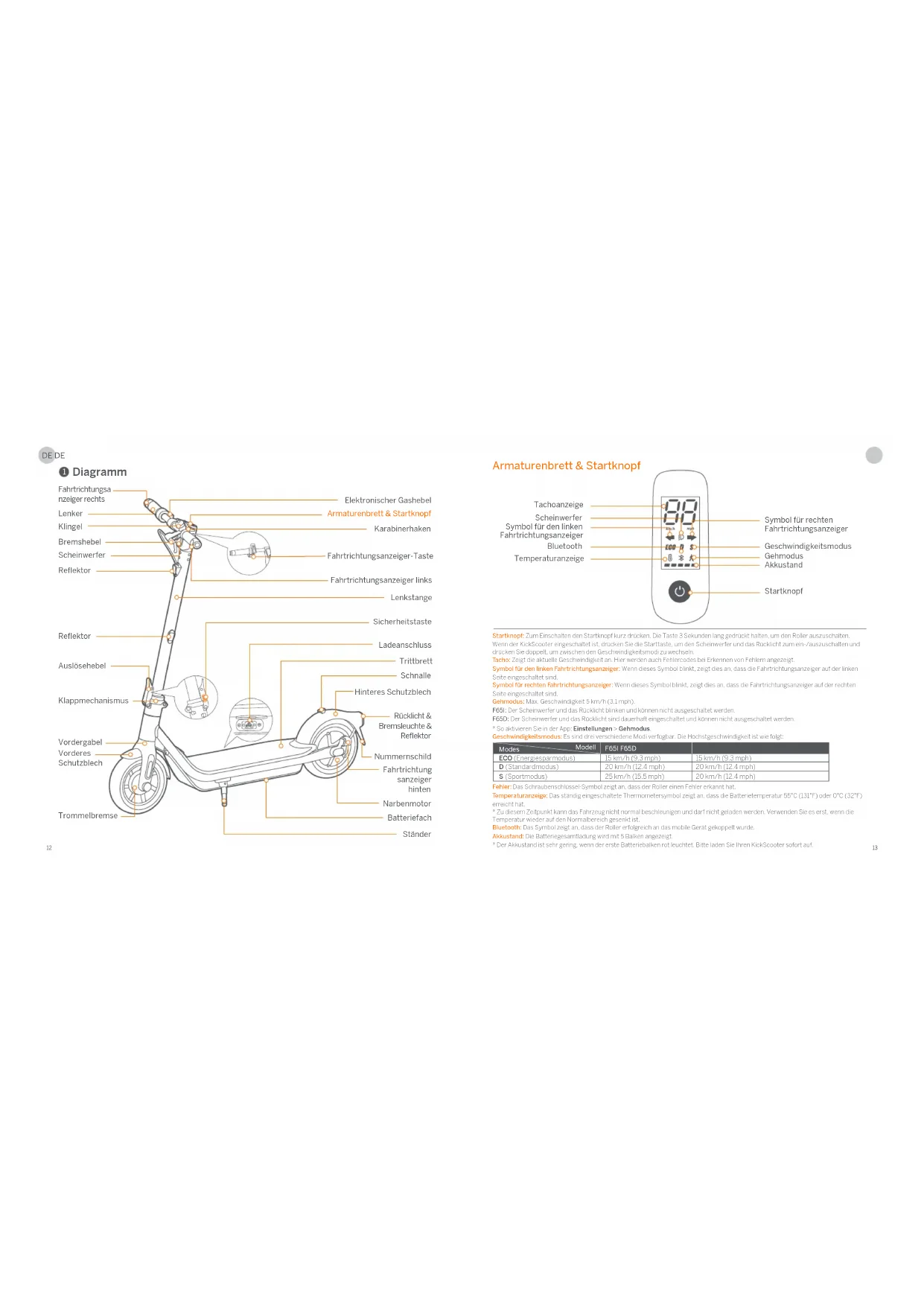 - Der Akkustand ist sehr gering, wenn der erste Batteriebalken rot leuchtet. Bitte laden Sie Ihren KickScooter sofort auf. Modell Modes F65I F65D 15 km/h (9.3 mph) 20 km/h (12.4 mph) 25 km/h (15.5 mph) 15 km/h (9.3 mph) 20 km/h (12.4 mph) 20 km/h (12.4 mph) ECO (Energiesparmodus) D (Standardmodus) S (Sportmodus) DE DE Fahrtrichtungsanzeiger-Taste
