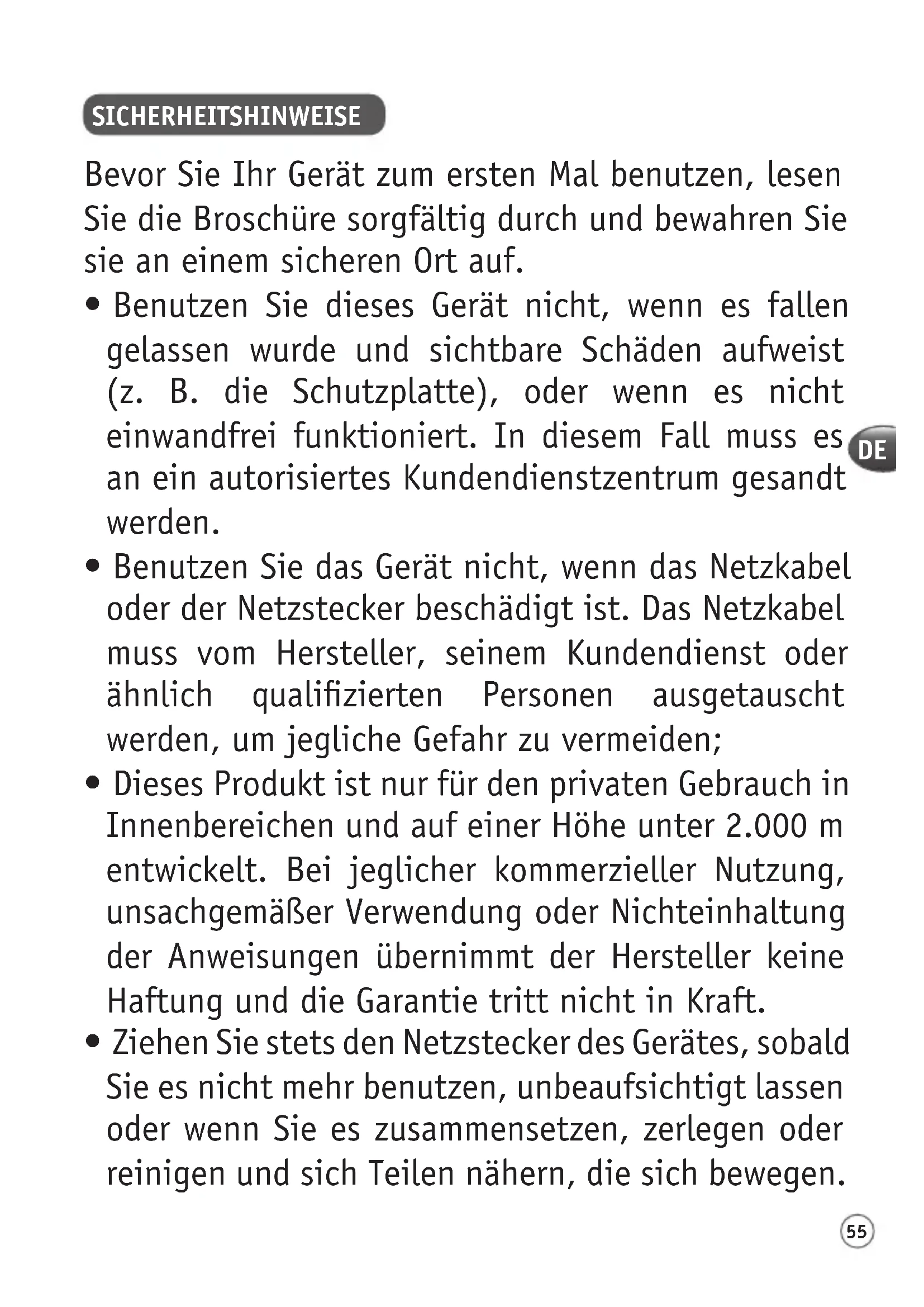 SICHERHEITSHINWEISE Bevor Sie Ihr Gerät zum ersten Mal benutzen, lesen Sie die Broschüre sorgfältig durch und bewahren Sie sie an einem sicheren Ort auf.