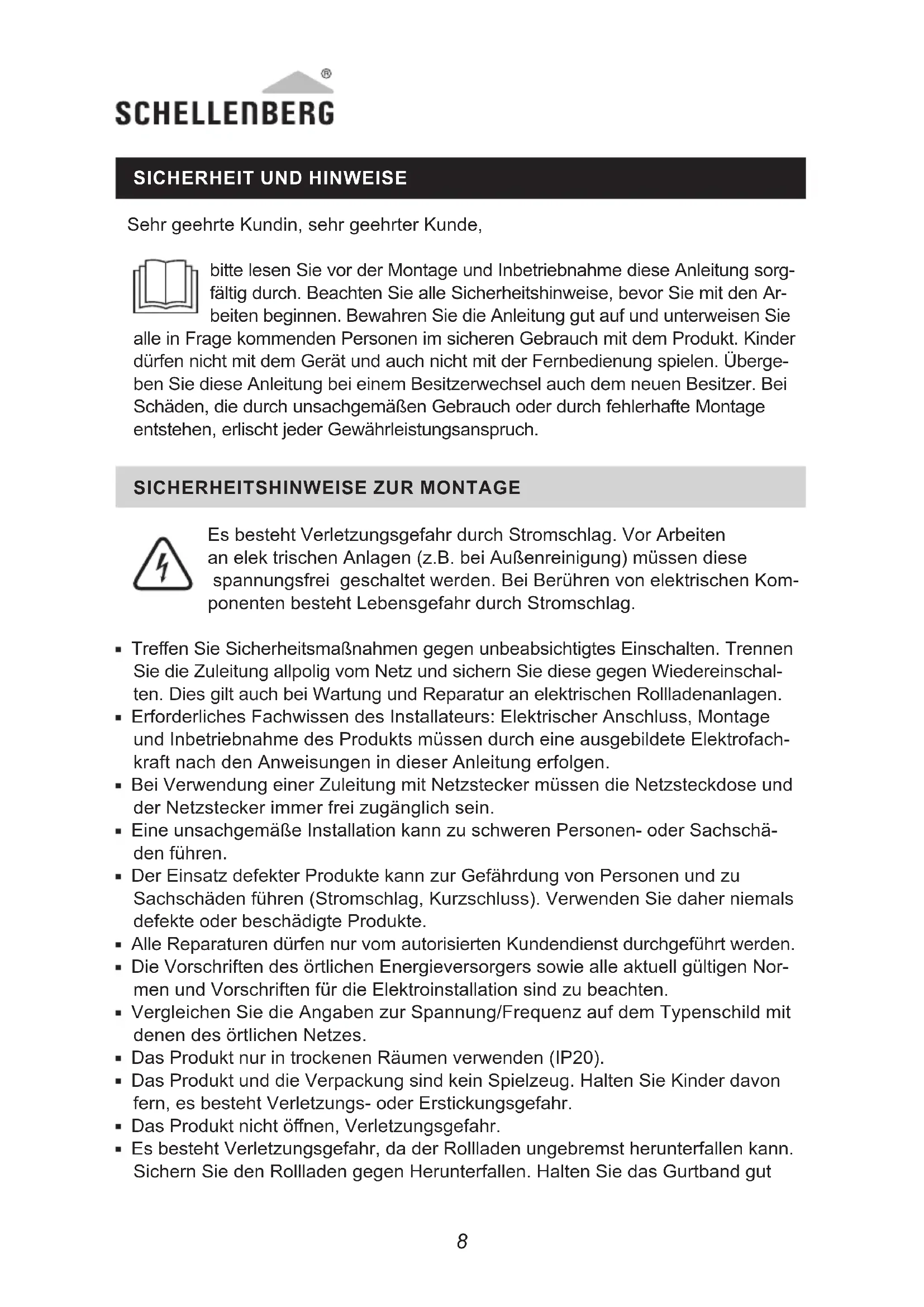 Es besteht Verletzungsgefahr durch Stromschlag Vor Arbeiten an elek trischen Anlagen (z.B. bei Außenreinigung) müssen diese spannungsfrei geschaltet werden. Bei Berühren von elektrischen Kom- ponenten besteht Lebensgefahr durch Stromschlag Treen Sie Sicherheitsmaßnahmen gegen unbeabsichtigtes Einschalten. Trennen Sie die Zuleitung allpolig vom Netz und sichern Sie diese gegen Wiedereinschal- ten. Dies gilt auch bei Wartung und Reparatur an elektrischen Rollladenanlagen. Erforderliches Fachwissen des Installateurs: Elektrischer Anschluss, Montage und Inbetriebnahme des Produkts müssen durch eine ausgebildete Elektrofach- kraft nach den Anweisungen in dieser Anleitung erfolgen Bei Verwendung einer Zuleitung mit Netzstecker müssen die Netzsteckdose und der Netzstecker immer frei zugänglich sein Eine unsachgemäße Installation kann zu schweren Personen- oder Sachschä- den führen. Der Einsatz defekter Produkte kann zur Gefährdung von Personen und zu Sachschäden führen (Stromschlag, Kurzschluss). Verwenden Sie daher niemals defekte oder beschädigte Produkte Alle Reparaturen dürfen nur vom autorisierten Kundendienst durchgeführt werden. Die Vorschriften des örtlichen Energieversorgers sowie alle aktuell gültigen Nor- men und Vorschriften für die Elektroinstallation sind zu beachten. Vergleichen Sie die Angaben zur Spannung/Frequenz auf dem Typenschild mit denen des örtlichen Netzes Das Produkt nur in trockenen Räumen verwenden (IP20). Das Produkt und die Verpackung sind kein Spielzeug Halten Sie Kinder davon fern, es besteht Verletzungs- oder Erstickungsgefahr. Das Produkt nicht önen, Verletzungsgefahr. Es besteht Verletzungsgefahr, da der Rollladen ungebremst herunterfallen kann. Sichern Sie den Rollladen gegen Herunterfallen. Halten Sie das Gurtband gut98
