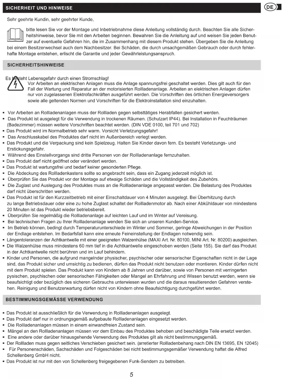 Sehr geehrte Kundin, sehr geehrter Kunde, bitte lesen Sie vor der Montage und Inbetriebnahme diese Anleitung vollständig durch. Beachten Sie alle Sicher- heitshinweise, bevor Sie mit den Arbeiten beginnen. Bewahren Sie die Anleitung auf und weisen Sie jeden Benut- zer auf eventuelle Gefahren hin, die im Zusammenhang mit diesem Produkt stehen. Übergeben Sie die Anleitung bei einem Besitzerwechsel auch dem Nachbesitzer. Bei Schäden, die durch unsachgemäßen Gebrauch oder durch fehler- hafte Montage entstehen, erlischt die Garantie und jeder Gewährleistungsanspruch. SICHERHEITSHINWEISE Es besteht Lebensgefahr durch einen Stromschlag! Vor Arbeiten an elektrischen Anlagen muss die Anlage spannungsfrei geschaltet werden. Dies gilt auch für den Fall der Wartung und Reparatur an der motorisierten Rollladenanlage. Arbeiten an elektrischen Anlagen dürfen nur von zugelassenen Elektrofachkräften ausgeführt werden. Die Vorschriften des örtlichen Energieversorgers sowie alle geltenden Normen und Vorschriften für die Elektroinstallation sind einzuhalten. Vor Arbeiten an Rollladenanlagen muss der Rollladen gegen selbsttätiges Herabfallen gesichert werden. Das Produkt ist ausgelegt für die Verwendung in trockenen Räumen. (Schutzart IP44). Bei Installation in Feuchträumen (Badezimmer) müssen weitere Vorschriften beachtet werden. (DIN VDE 0100, teil 701 und 702) Das Produkt wird im Normalbetrieb sehr warm. Vorsicht Verletzungsgefahr! Das Anschlusskabel des Produktes darf nicht im Außenbereich verlegt werden. Das Produkt und die Verpackung sind kein Spielzeug. Halten Sie Kinder davon fern. Es besteht Verletzungs- und Erstickungsgefahr. Während des Einstellvorgangs sind dritte Personen von der Rollladenanlage fernzuhalten. Das Produkt darf nicht geönet oder verändert werden. Das Produkt ist wartungsfrei und bedarf keiner gesonderten Pege. Die Abdeckung des Rollladenkastens sollte so angebracht sein, dass ein Zugang jederzeit möglich ist. Überprüfen Sie das Produkt vor der Montage auf etwaige Schäden und die Vollständigkeit des Zubehörs. Die Zuglast und Auslegung des Produktes muss an die Rollladenanlage angepasst werden. Die Belastung des Produktes darf nicht überschritten werden. Das Produkt ist für den Kurzzeitbetrieb mit einer Einschaltdauer von 4 Minuten ausgelegt. Bei Überhitzung durch zu lange Betriebsdauer oder eine zu hohe Zuglast schaltet der Rollladenmotor ab. Nach einer Abkühldauer von mindestens 20 Minuten ist das Produkt wieder betriebsbereit. Überprüfen Sie regelmäßig die Rollladenanlage auf leichten Lauf und im Winter auf Vereisung. Bei technischen Fragen zu Ihrer Rollladenanlage wenden Sie sich an unseren Kunden-Service. Im Betrieb können, bedingt durch Temperaturunterschiede im Winter und Sommer, geringe Abweichungen in der Position der Endlage entstehen. Im Bedarfsfall kann eine erneute Feineinstellung der Endlagen notwendig sein. Längentoleranzen der Achtkantwelle mit einer geeigneten Walzenhülse (MAXI Art. Nr. 80100, MINI Art. Nr. 80200) ausgleichen. Die Walzenhülse muss mindestens 60 mm tief in die Achtkantwelle eingeschoben werden (Seite 155). Sie darf das Produkt in der Achtkantwelle nicht berühren und im Lauf behindern. Kinder und Personen, die aufgrund mangelnder physischer, psychischer oder sensorischer Eigenschaften nicht in der Lage sind, das Produkt sicher und umsichtig zu bedienen, dürfen das Produkt nicht benutzen oder montieren. Kinder dürfen nicht mit dem Produkt spielen. Das Produkt kann von Kindern ab 8 Jahren und darüber, sowie von Personen mit verringerten pysischen, psychischen oder sensorischen Fähigkeiten oder Mangel an Ehrfahrung und Wissen benutzt werden, wenn sie beaufsichtigt oder bezüglich des sicheren Gebrauchs unterwiesen wurden und die daraus resultierenden Gefahren verste- hen. Reinigung und Benutzerwartung dürfen nicht von Kindern ohne Beaufsichtigung durchgeführt werden.