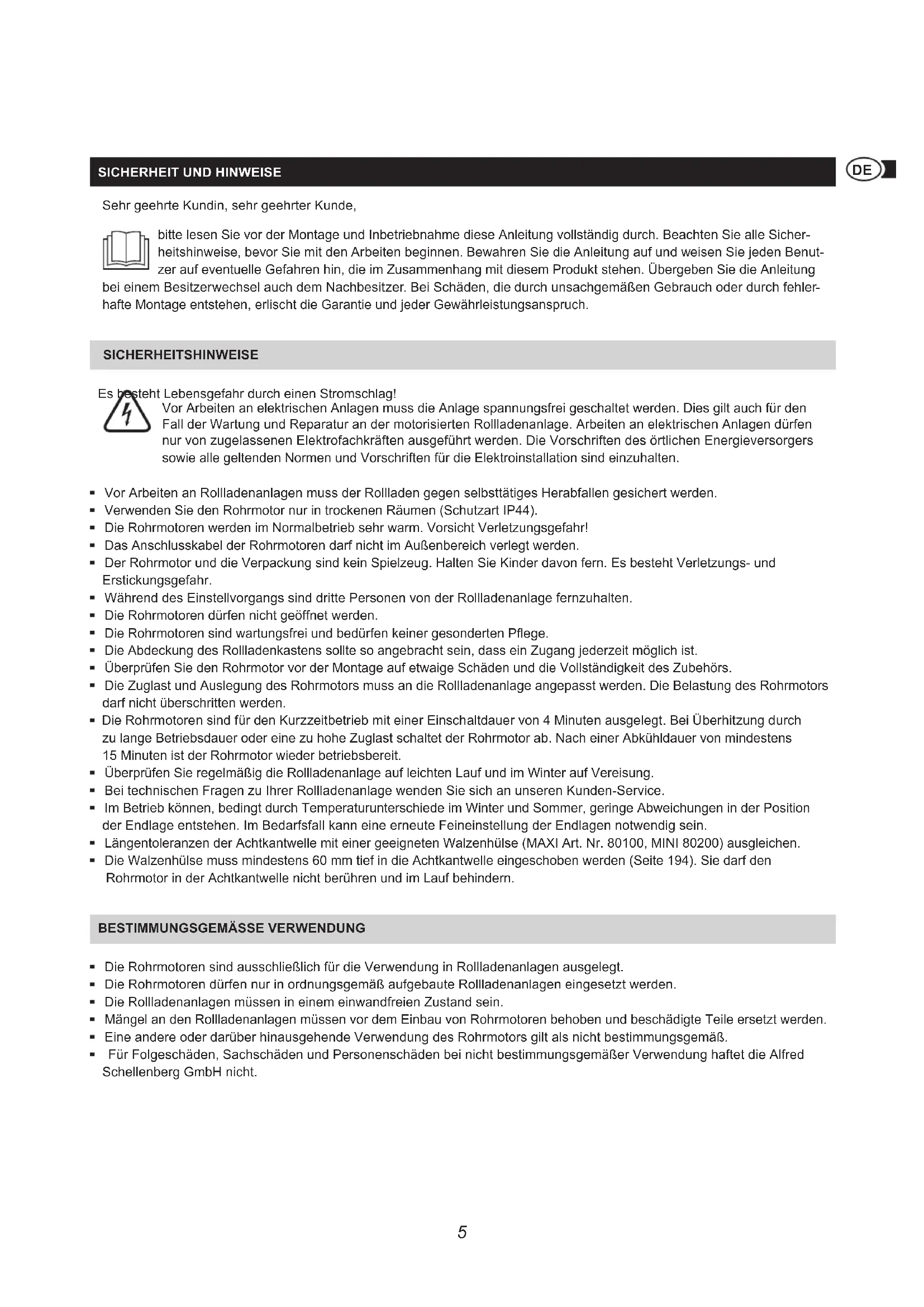 SICHERHEIT UND HINwEISE Sehr geehrte Kundin, sehr geehrter Kunde, bitte lesen Sie vor der Montage und Inbetriebnahme diese Anleitung vollständig durch. Beachten Sie alle Sicher- heitshinweise, bevor Sie mit den Arbeiten beginnen. Bewahren Sie die Anleitung auf und weisen Sie jeden Benut- zer auf eventuelle Gefahren hin, die im Zusammenhang mit diesem Produkt stehen. Übergeben Sie die Anleitung bei einem Besitzerwechsel auch dem Nachbesitzer. Bei Schäden, die durch unsachgemäßen Gebrauch oder durch fehler- hafte Montage entstehen, erlischt die Garantie und jeder Gewährleistungsanspruch. SICHERHEITSHINwEISE Es besteht Lebensgefahr durch einen Stromschlag! Vor Arbeiten an elektrischen Anlagen muss die Anlage spannungsfrei geschaltet werden. Dies gilt auch für den Fall der Wartung und Reparatur an der motorisierten Rollladenanlage. Arbeiten an elektrischen Anlagen dürfen nur von zugelassenen Elektrofachkräften ausgeführt werden. Die Vorschriften des örtlichen Energieversorgers sowie alle geltenden Normen und Vorschriften für die Elektroinstallation sind einzuhalten. Vor Arbeiten an Rollladenanlagen muss der Rollladen gegen selbsttätiges Herabfallen gesichert werden. Verwenden Sie den Rohrmotor nur in trockenen Räumen (Schutzart IP44). Die Rohrmotoren werden im Normalbetrieb sehr warm. Vorsicht Verletzungsgefahr! Das Anschlusskabel der Rohrmotoren darf nicht im Außenbereich verlegt werden. Der Rohrmotor und die Verpackung sind kein Spielzeug. Halten Sie Kinder davon fern. Es besteht Verletzungs- und Erstickungsgefahr. Während des Einstellvorgangs sind dritte Personen von der Rollladenanlage fernzuhalten. Die Rohrmotoren dürfen nicht geöffnet werden. Die Rohrmotoren sind wartungsfrei und bedürfen keiner gesonderten Pege. Die Abdeckung des Rollladenkastens sollte so angebracht sein, dass ein Zugang jederzeit möglich ist. Überprüfen Sie den Rohrmotor vor der Montage auf etwaige Schäden und die Vollständigkeit des Zubehörs. Die Zuglast und Auslegung des Rohrmotors muss an die Rollladenanlage angepasst werden. Die Belastung des Rohrmotors darf nicht überschritten werden. Die Rohrmotoren sind für den Kurzzeitbetrieb mit einer Einschaltdauer von 4 Minuten ausgelegt. Bei Überhitzung durch zu lange Betriebsdauer oder eine zu hohe Zuglast schaltet der Rohrmotor ab. Nach einer Abkühldauer von mindestens 15 Minuten ist der Rohrmotor wieder betriebsbereit. Überprüfen Sie regelmäßig die Rollladenanlage auf leichten Lauf und im Winter auf Vereisung. Bei technischen Fragen zu Ihrer Rollladenanlage wenden Sie sich an unseren Kunden-Service. Im Betrieb können, bedingt durch Temperaturunterschiede im Winter und Sommer, geringe Abweichungen in der Position der Endlage entstehen. Im Bedarfsfall kann eine erneute Feineinstellung der Endlagen notwendig sein. Längentoleranzen der Achtkantwelle mit einer geeigneten Walzenhülse (MAXI Art. Nr. 80100, MINI 80200) ausgleichen. Die Walzenhülse muss mindestens 60 mm tief in die Achtkantwelle eingeschoben werden (Seite 194). Sie darf den Rohrmotor in der Achtkantwelle nicht berühren und im Lauf behindern. BESTImmUNGSGEmäSSE VERwENDUNG Die Rohrmotoren sind ausschließlich für die Verwendung in Rollladenanlagen ausgelegt. Die Rohrmotoren dürfen nur in ordnungsgemäß aufgebaute Rollladenanlagen eingesetzt werden. Die Rollladenanlagen müssen in einem einwandfreien Zustand sein. Mängel an den Rollladenanlagen müssen vor dem Einbau von Rohrmotoren behoben und beschädigte Teile ersetzt werden. Eine andere oder darüber hinausgehende Verwendung des Rohrmotors gilt als nicht bestimmungsgemäß. Für Folgeschäden, Sachschäden und Personenschäden bei nicht bestimmungsgemäßer Verwendung haftet die Alfred Schellenberg GmbH nicht.6